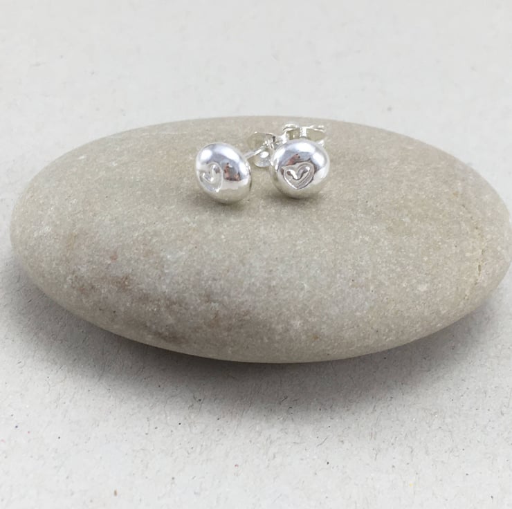 These sterling silver pebble stud earrings are inspired by the beach and sea; the ripples and texture of sand, the pebbles on the shoreline. Each earring is handstamped with a heart motif. I love the high polish of the silver surface. These would make a wonderful gift for anyone who loves craft jewellery, silver earrings, or indeed a little treat for yourself! Perfect for every day wear!