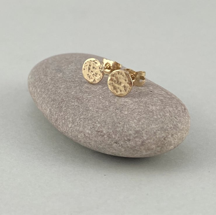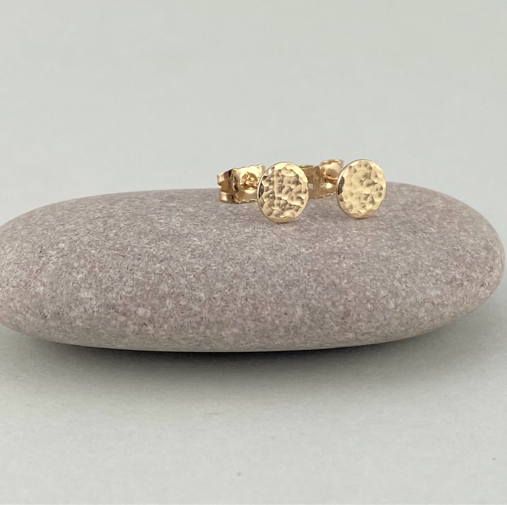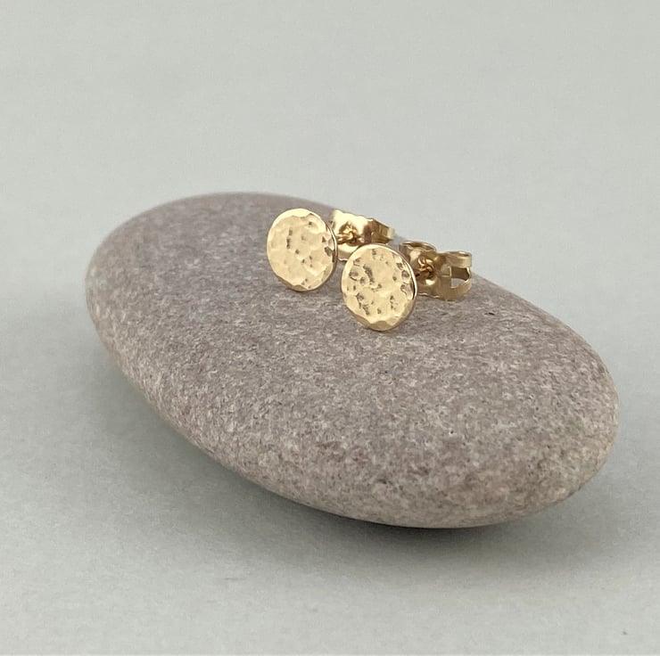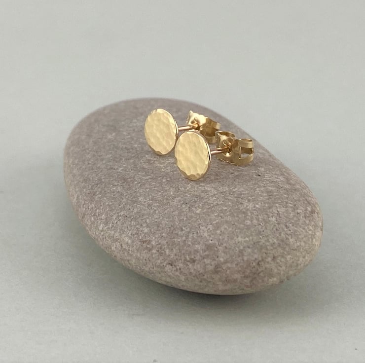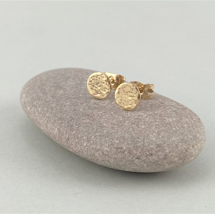These 6 - 7 mm hammered disc stud earrings are made using eco-friendly recycled 9ct yellow gold and are inspired by the beach and sea; the ripples and texture of sand, the pebbles on the shoreline. I love the high polish of the hammered gold surface and the way they glimmer as they are worn. These would make a wonderful gift for anyone who loves craft jewellery, gold jewellery, or indeed a little treat for yourself! Perfect for every day wear!