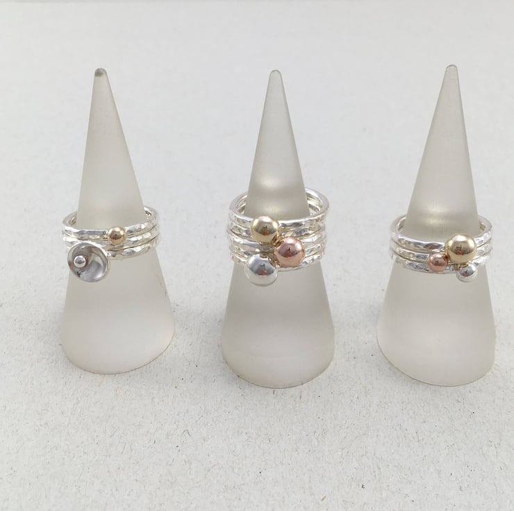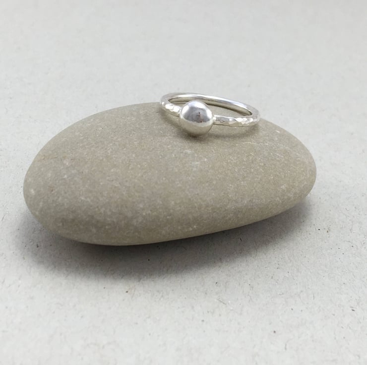 Simple, wearable hammered silver pebble stacking ring made from sturdy round 2 mm silver and finished with a large silver pebble measuring approx 7 mm in diameter. These rings are made to order and can be created in any size. They look great when stacked together or when worn alongside other jewellery. Perfect for any finger and with the ability to add to your collection over time, adding different textures and styles. They are perfect for both men and women - I personally wear a set of four silver and one red gold stacking rings - all with hammered texture. As these are made to order there may be some differences to the ring shown in the image.