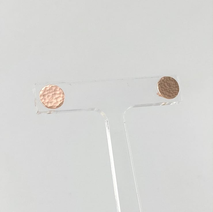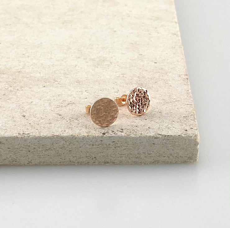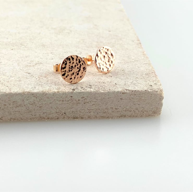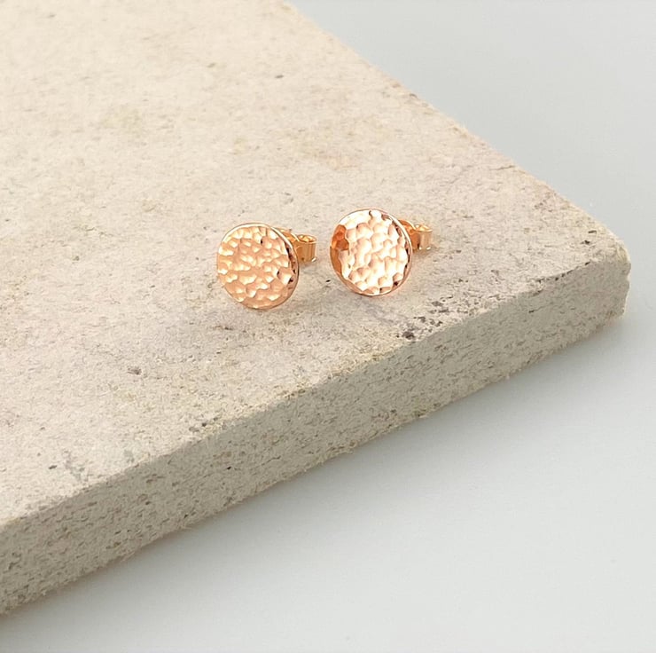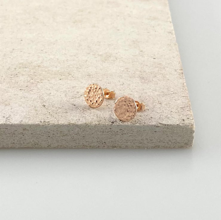 These 8mm hammered disc stud earrings are made using eco-friendly recycled 9ct red gold and are inspired by the beach and sea; the ripples and texture of sand, the pebbles on the shoreline. I love the high polish of the hammered gold surface and the way they glimmer as they are worn. These would make a wonderful gift for anyone who loves craft jewellery, gold jewellery, or indeed a little treat for yourself! Perfect for every day wear!