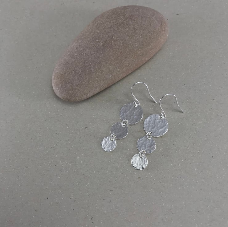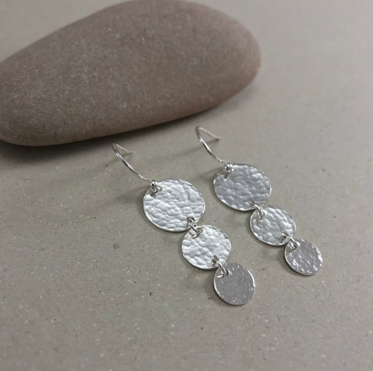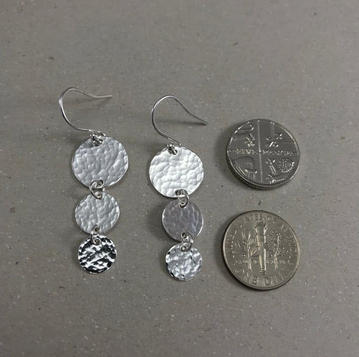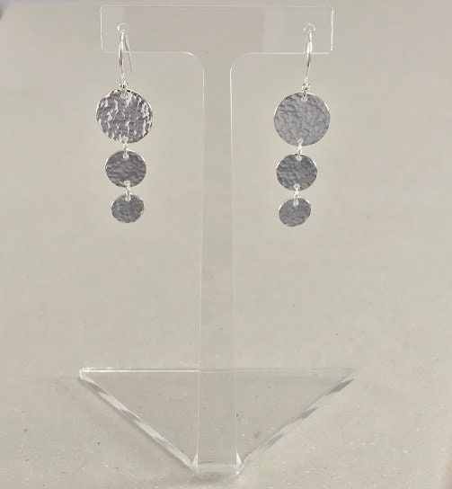 These contemporary disc dangle earrings are made from hammered sterling silver are perfect for everyday wear. Comprised of three graduated silver discs, their modern, minimalist look is subtle yet effective and can be worn by anyone. I love the high polish of the hammered silver surface and the way they glimmer as they are worn. Included with these earrings are an optional pair of clear hypoallergenic ear backs.