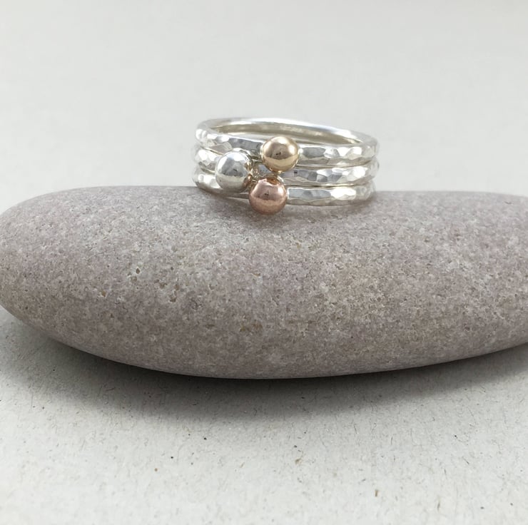 Simple, wearable hammered silver stacking ring made from sturdy round 2 mm silver and finished with a 9ct red gold pebble measuring approx. 4mm in diameter. These rings are made to order and can be created in any size. They look great when stacked together or when worn alongside other jewellery. Perfect for any finger and with the ability to add to your collection over time, adding different textures and styles. They are perfect for both men and women - I personally wear a set of four silver and one red gold stacking rings - all with hammered texture. These rings are hallmarked with my makers mark at the London Assay Office at Goldsmiths' Hall.