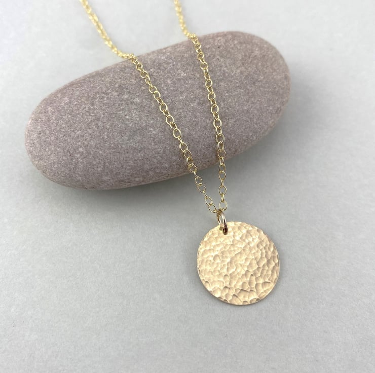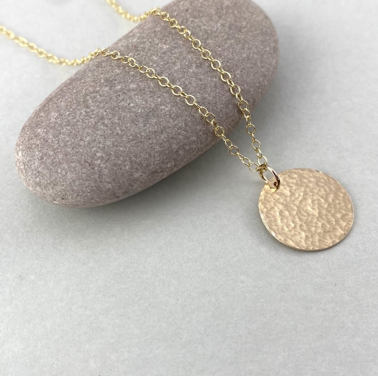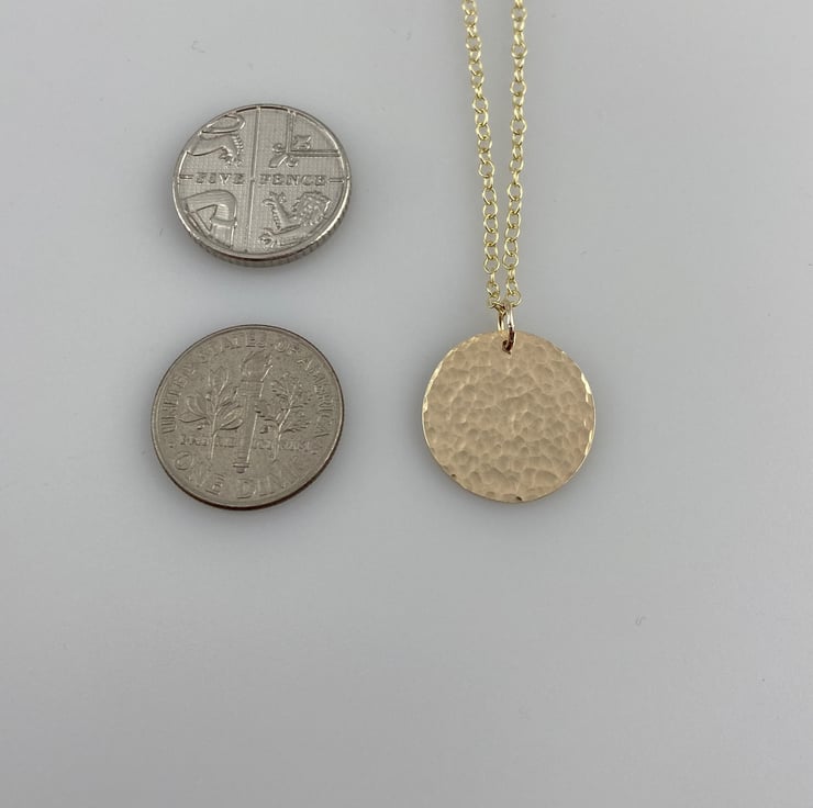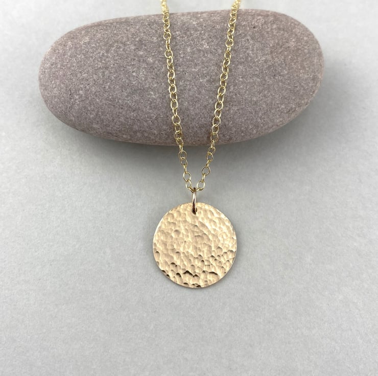 These fully hallmarked, hammered medium 9ct yellow gold disc pendants are inspired by the beach and sea; the ripples and texture of sand, the pebbles on the shoreline. The disc has been handcrafted from recycled 9ct gold and as each one is handmade and hand hammered, no two will ever be the same. I love the way the light catches the high polish of the gold. This would make a wonderful gift for anyone who loves jewellery or indeed a little treat for yourself! Available on a lovely hallmarked trace chain in 16" or 18". These pendants are hallmarked with my makers mark at the London Assay Office at Goldsmiths' Hall.