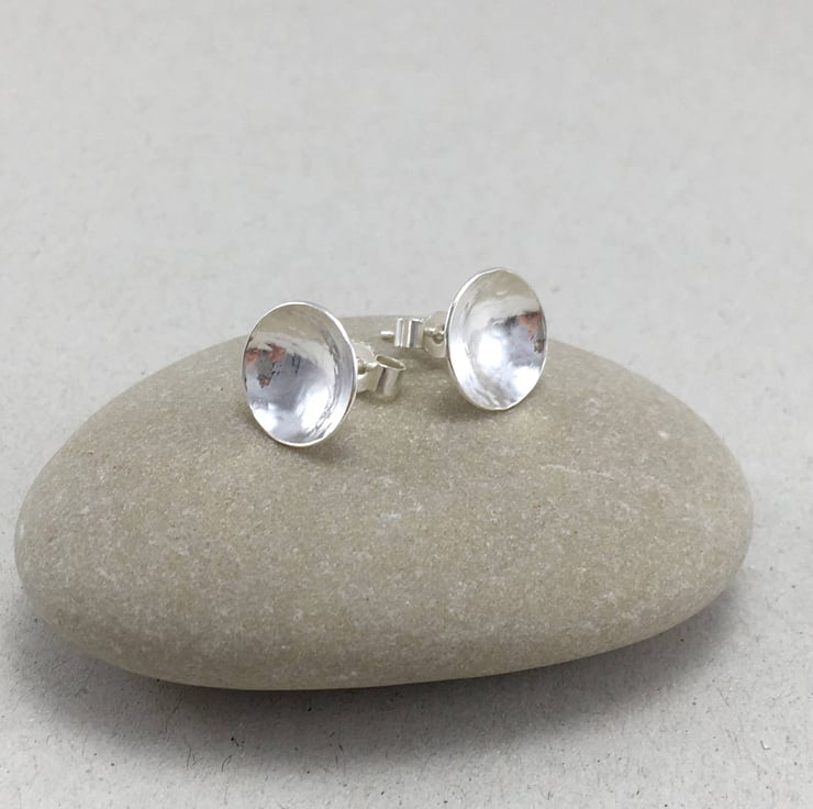 These handmade sterling silver dome stud earrings have been concaved and given a high reflective polish. Each dome has been hammered to add a lovely surface texture. I love the shimmer and shine of the silver and the way the hammered texture catches the light. This would make a wonderful gift for anyone who loves craft jewellery or indeed a little treat for yourself!