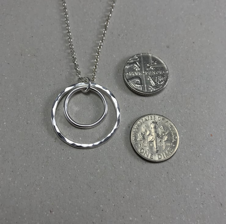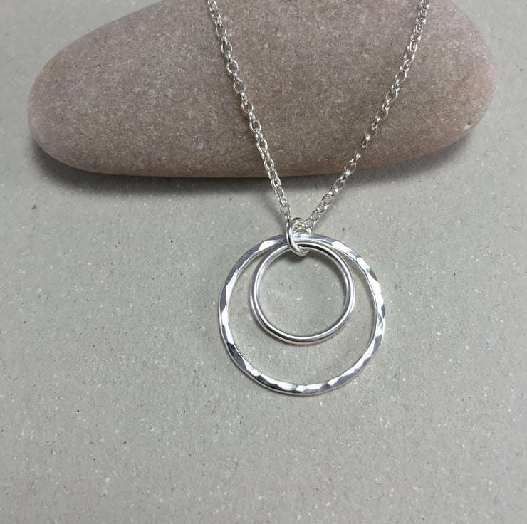 This minimalist hammered sterling silver double circle pendant is comprised of two silver circles, one hammered and one left smooth with a high polish. I love the way the light catches the hammered detail. Both circles are independent and move which adds interest. Great for layering and everyday wear. This would make a wonderful gift for anyone who loves craft jewellery or silver, or indeed a little treat for yourself!
