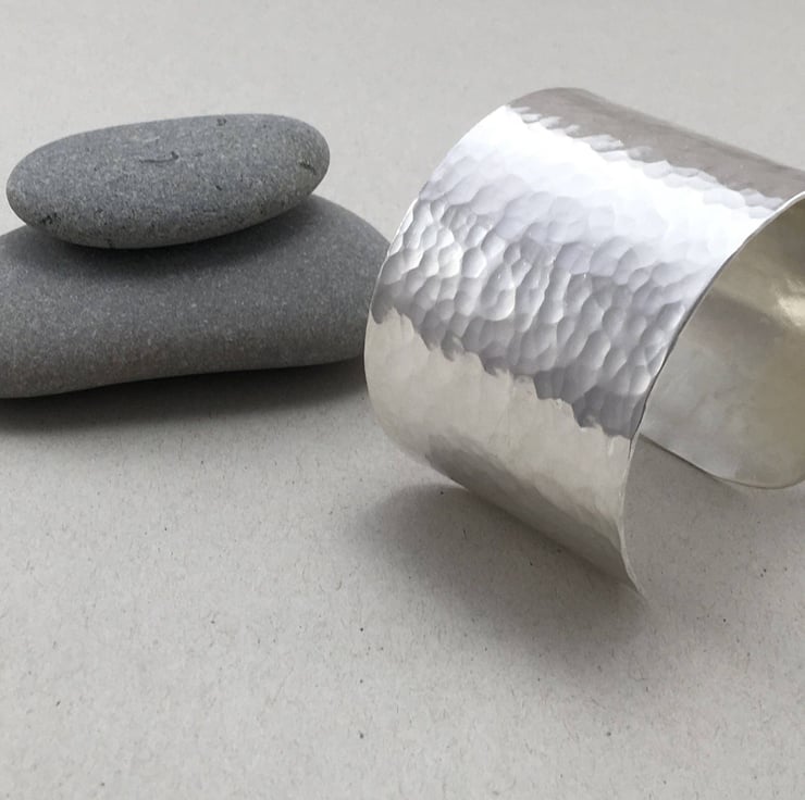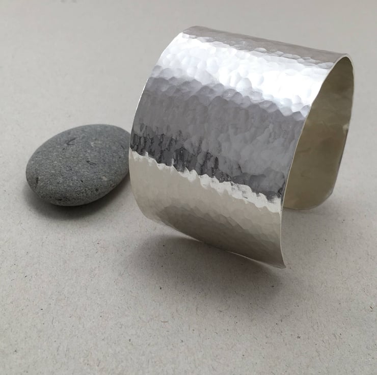 These wide sterling silver cuffs are made by myself in my workshop. The cuffs have been hammered and shaped by hand and have been polished to a high shine which catches the light wonderfully. The cuffs themselves measures c. 4.5 cm in width with an opening of around 2.5cm. They are available in two sizes; Medium (c. 150 - 155 mm of silver (external) plus c. 25mm opening) or Large (c. 160 - 165 mm of silver (external) plus c. 25mm opening). If you require a larger or small size just send me a message.