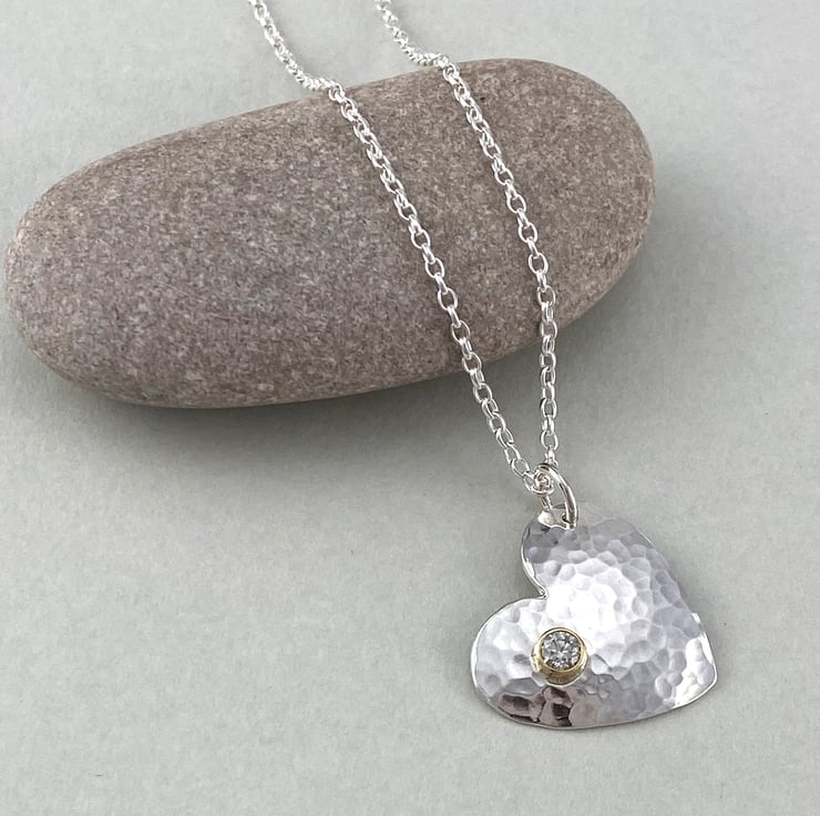 This hammered, domed and polished sterling silver, 9ct yellow gold and 0.14ct natural diamond heart pendant was made by myself and has been fully hallmarked at Goldsmiths' Hall at the London Assay Office. The heart itself measures around 20mm across and is suspended on a lovely belcher chain. The sterling silver heart is hammered, domed and polished which means it sparkles as the wearer moves into different light. In the corner of the heart is a diamond measuring c. 3.3 mm in diameter set in 9ct yellow gold. I really love the high polish on this necklace and the way the hammered detail and the diamond detailing. Diamond is the birthstone for April so would make a wonderful gift for anyone with a birthday in this month, for a Valentines gift or indeed for someone you love. This piece is hallmarked with my sponsors mark "MJB" at Goldsmiths' Hall Assay Office in London.
