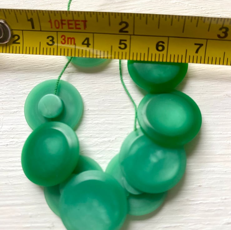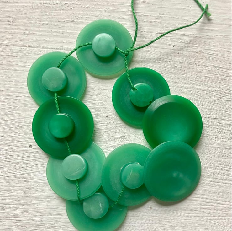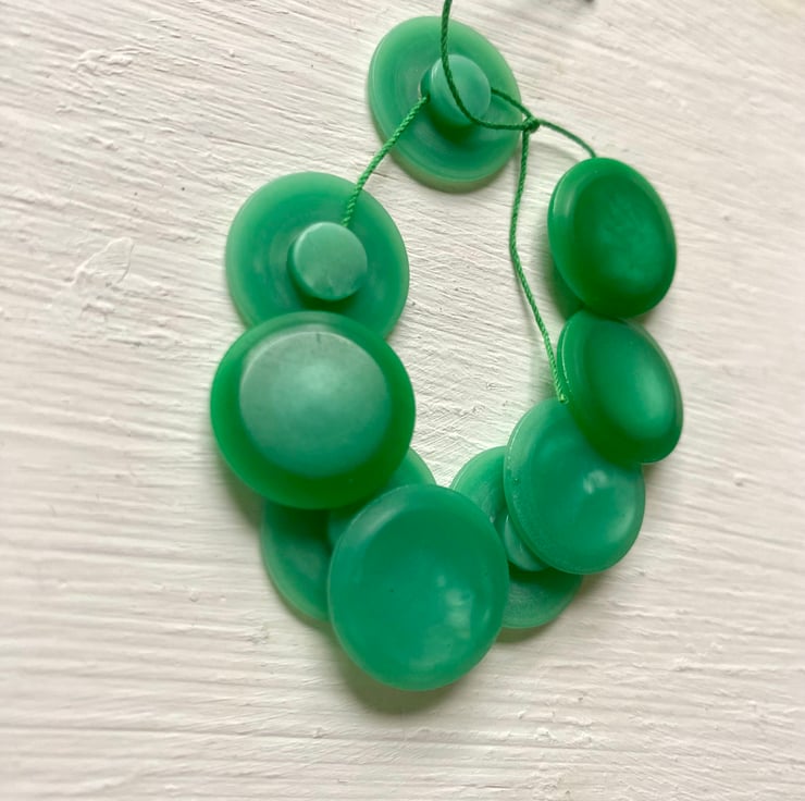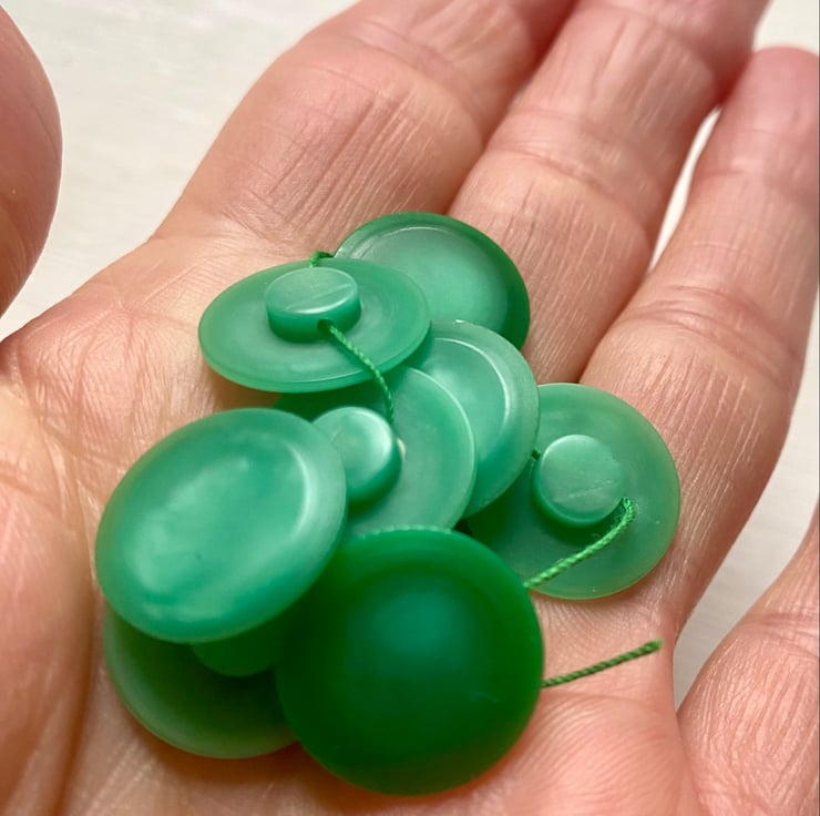 Measuring 2cm in diameter with shank for attaching. Set of 9 matching green vintage buttons.