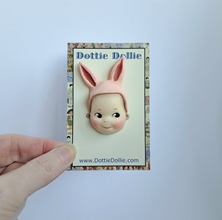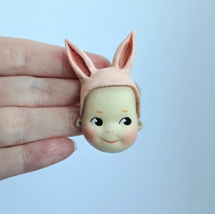 Peach Kewpie Bunny Brooch is a handmade recreation of a real broken antique doll head from my collection. The original head is dirty and unloved, having been discarded and buried as rubbish almost a hundred years ago.