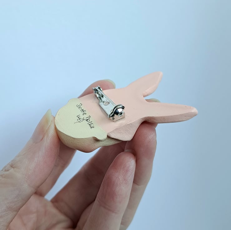 Kewpie Bunny is hand cast in resin, making her light and durable to wear. She was carefully hand-painted with acrylic paint and soft pastels, and has a gently aged finish.