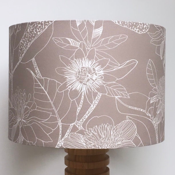 This is a beautiful and simple white botanical design on a plain mink panama cotton. The lampshade would be a perfect choice for a contemporary, neutral tones modern space.