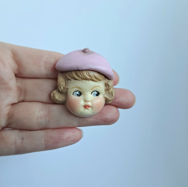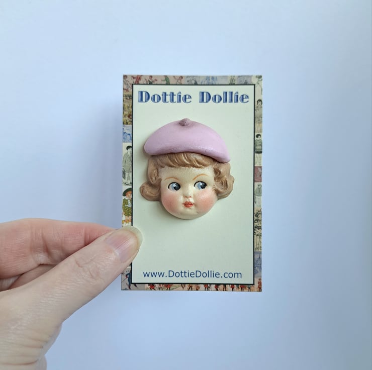Dottie Dollie Pin Brooch - Rose with a Pink Beret is a handmade replica of a real broken antique doll head from my collection, the original head was broken, dirty and unloved, having been discarded and buried as rubbish about a hundred years ago.