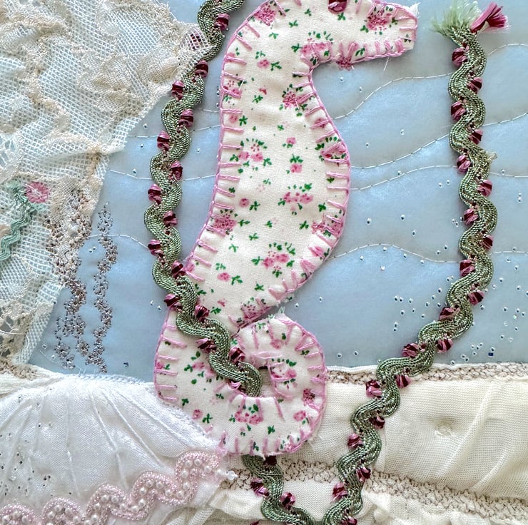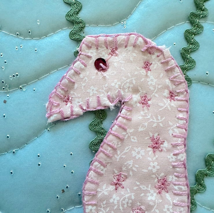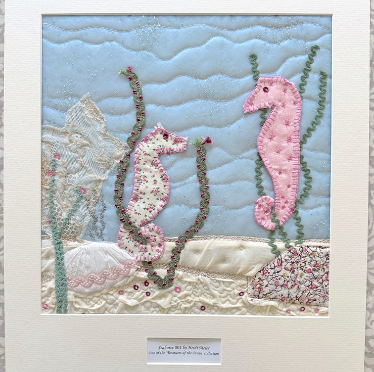 Gorgeous textile artwork depicting two pink textile seahorses, made from applique, machine, free machine and hand embroidery techniques.