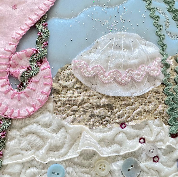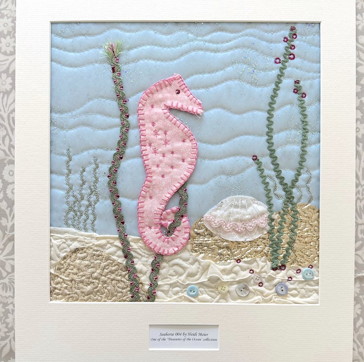 Gorgeous textile artwork depicting a pink textile seahorse, made from applique, machine, free machine and hand embroidery techniques. There are also other embroidered elements such as a pearl clam and some colourful seaweed.