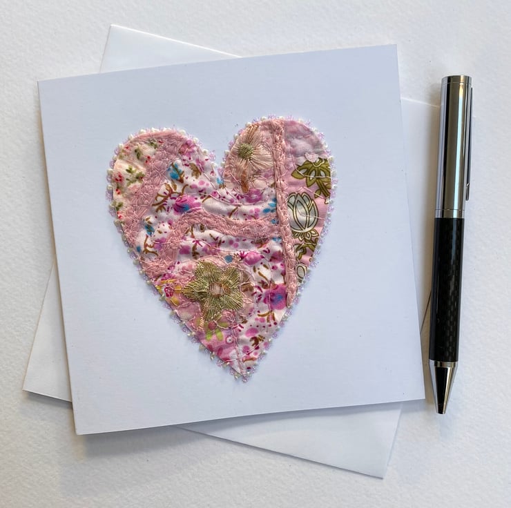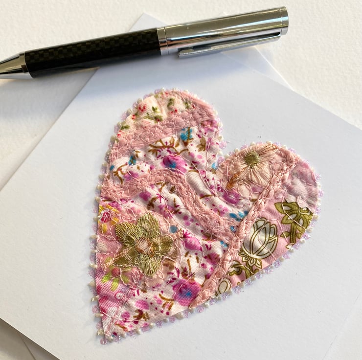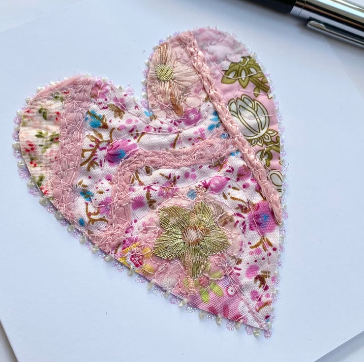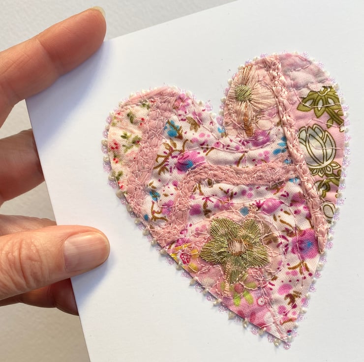 This enchanting embroidered heart has been made with my own handmade up-cycled fabric and enhanced with free motion embroidery. It’s framed with 3-d paint. It’s perfect for a wedding, anniversary, engagement, Valentines or for someone very special. It is blank inside making it ideal for any occasion. This white card measures 14.5 x 14.5cm, comes with an envelop and in a plastic cover for protection.