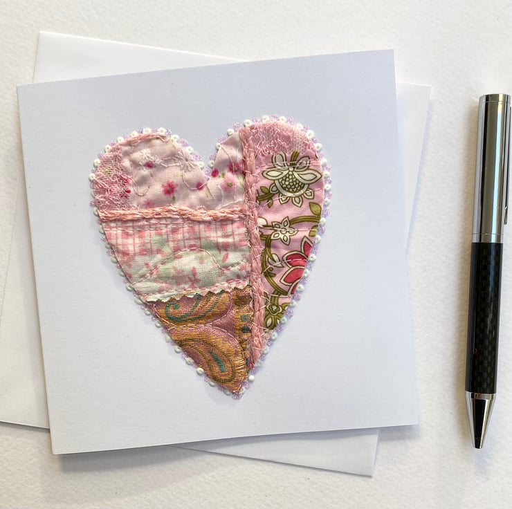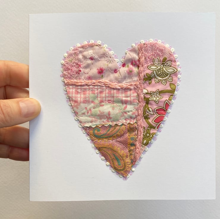 This enchanting embroidered heart has been made with my own handmade up-cycled fabric and enhanced with free motion embroidery. It’s framed with 3-d paint. It’s perfect for a wedding, anniversary, engagement, Valentines or for someone very special. It is blank inside making it ideal for any occasion. This white card measures 14.5 x 14.5cm, comes with an envelop and in a plastic cover for protection.