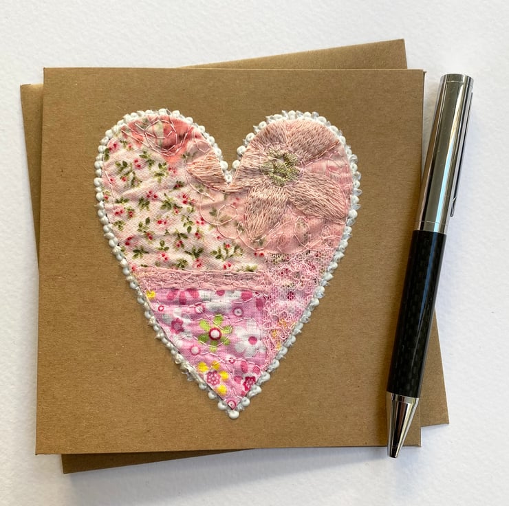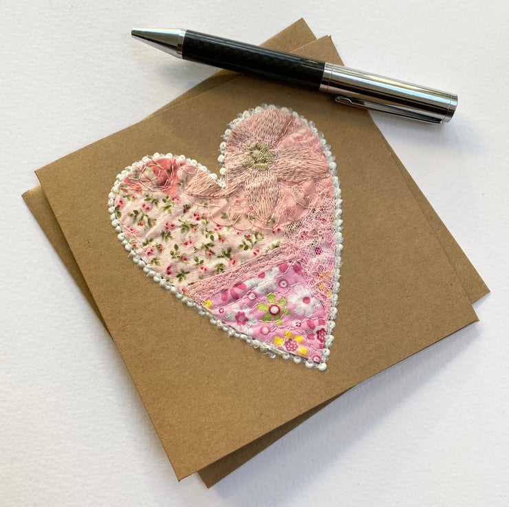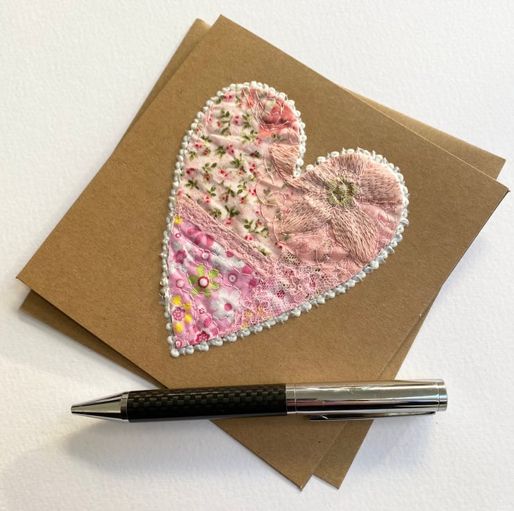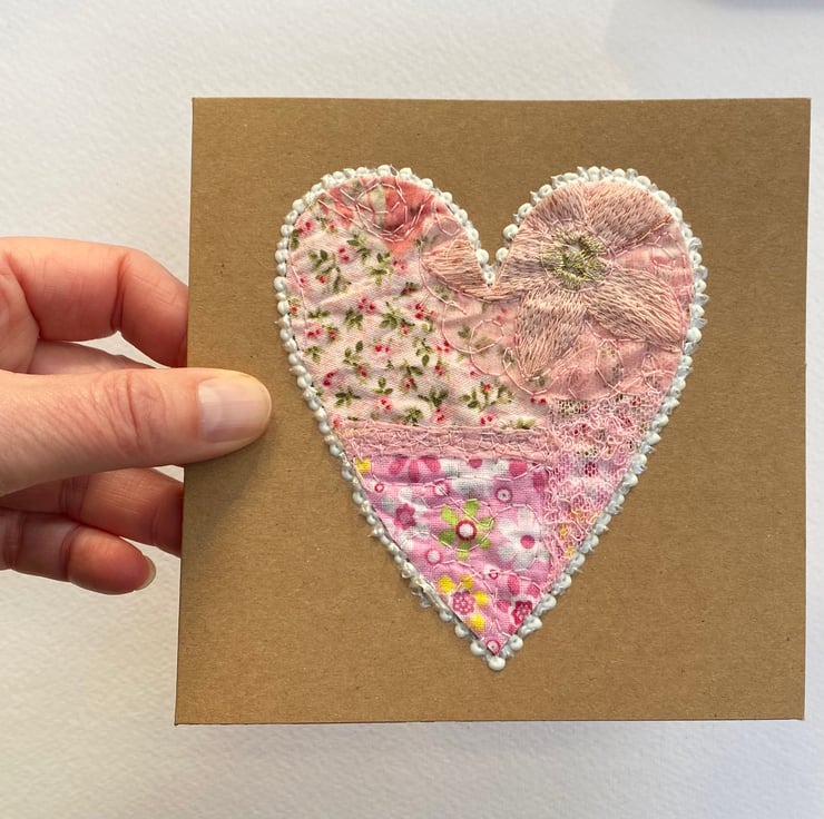 This enchanting embroidered pink heart card has been made with up-cycled fabrics, threads, lace, framed with 3-D paint and enhanced with free motion embroidery. It’s perfect for Valentine’s Day, wedding card, anniversary card or for a very special occasion. It is blank inside. The recycled brown card measures 13.5 x 13.5cm, comes with an envelop and in a plastic cover for protection.