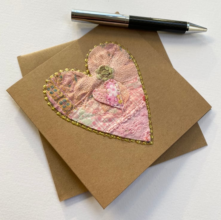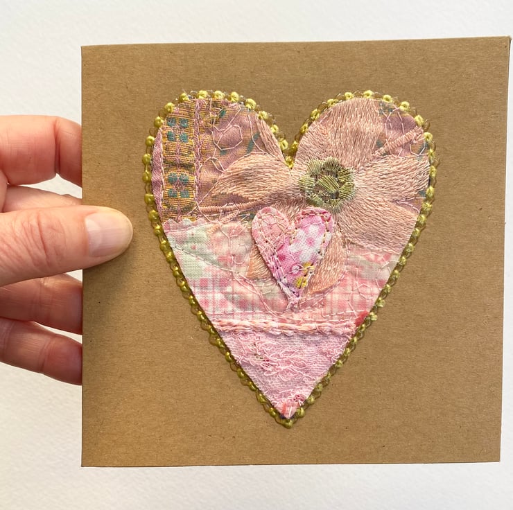 This enchanting embroidered pink heart card has been made with up-cycled fabrics, threads, lace, framed with 3-D paint and enhanced with free motion embroidery. It’s perfect for Valentine’s Day, wedding card, anniversary card or for a very special occasion. It is blank inside. The recycled brown card measures 13.5 x 13.5cm, comes with an envelop and in a plastic cover for protection.