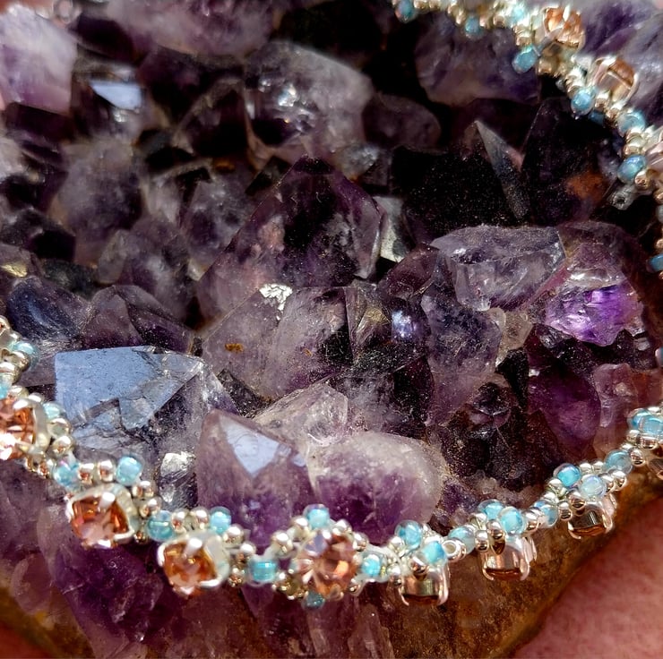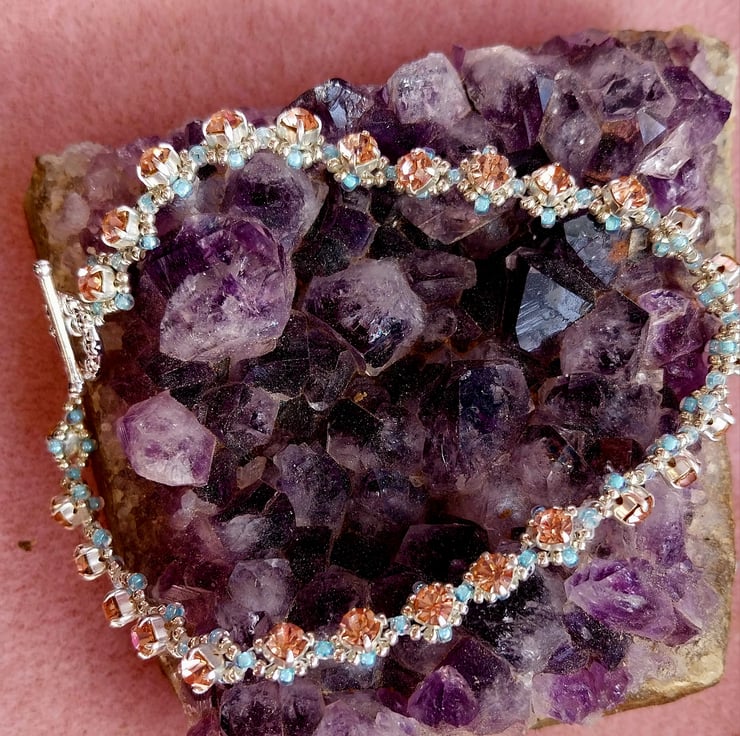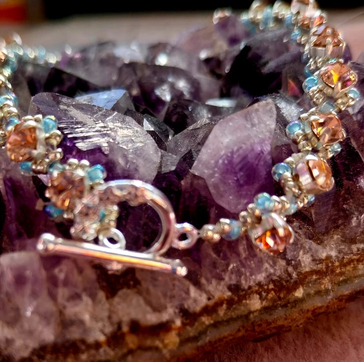 This delicate beaded bracelet has been lovingly made using seed beads and sew in crystal beads. It has a silver plated toggle clasp. The bracelet measures approximately 8 inches in length excluding the clasp.