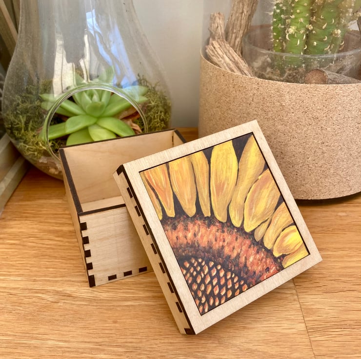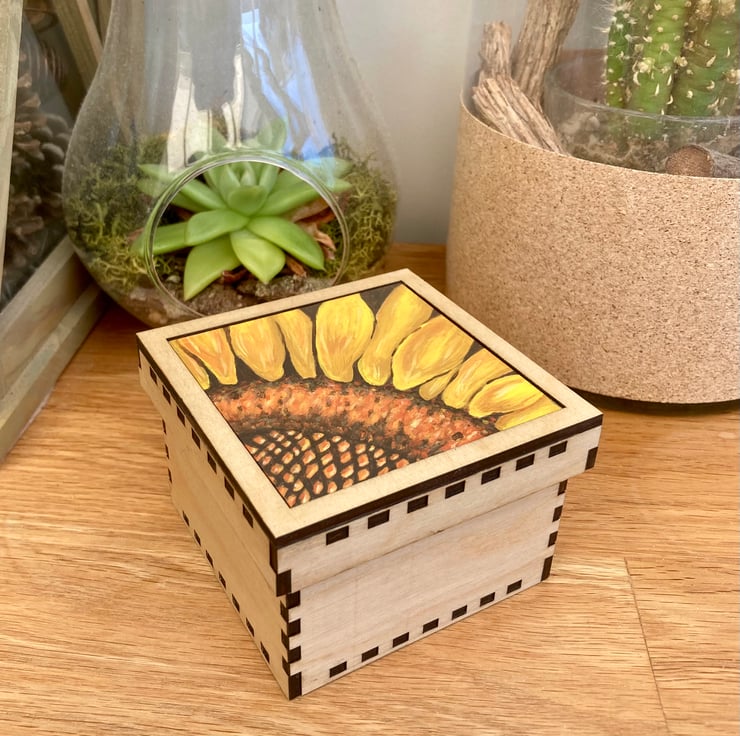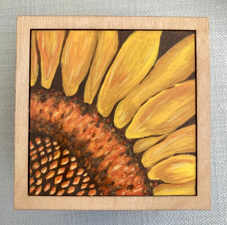 Lovely little plywood trinket box with a hand painted close up of a sunflower.