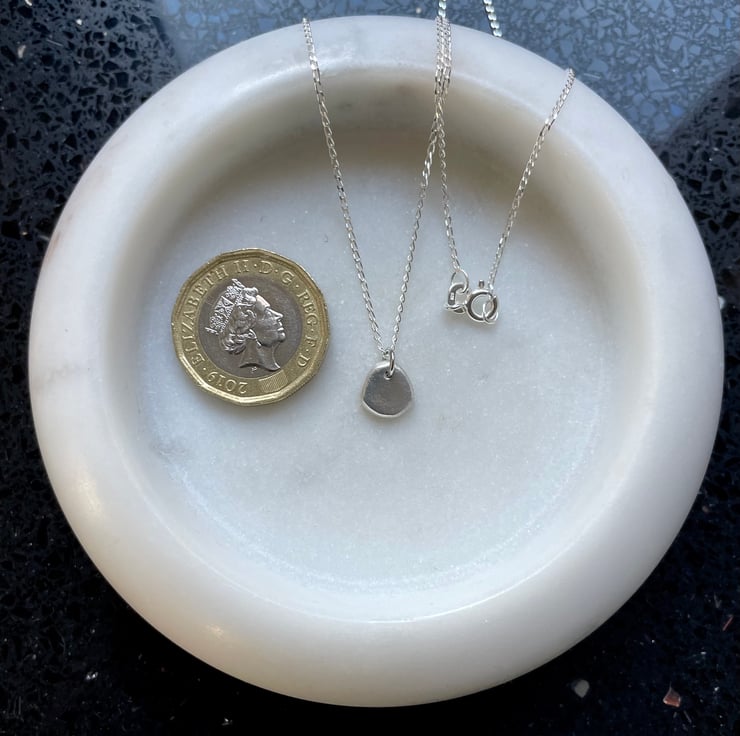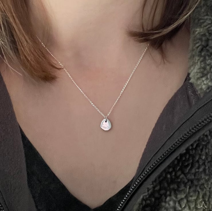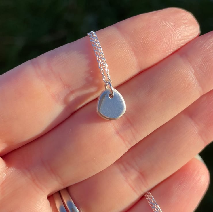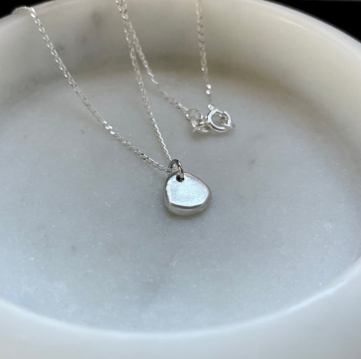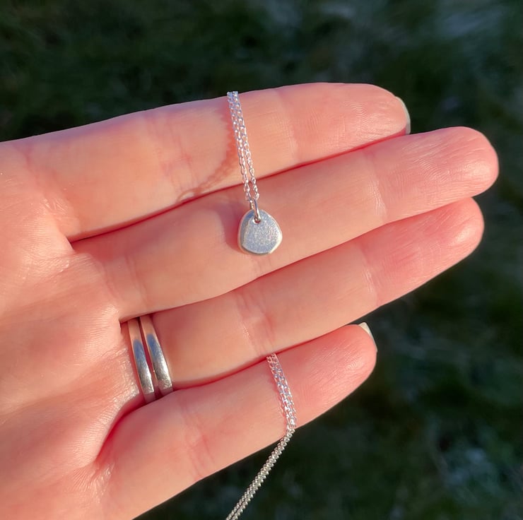 Handmade pebble-shaped pendant made from 999 (99% pure) silver. Sterling silver chain – 18” long. Perfect for layering or worn alone. Small jewellery bag and polishing cloth included.
