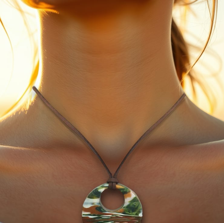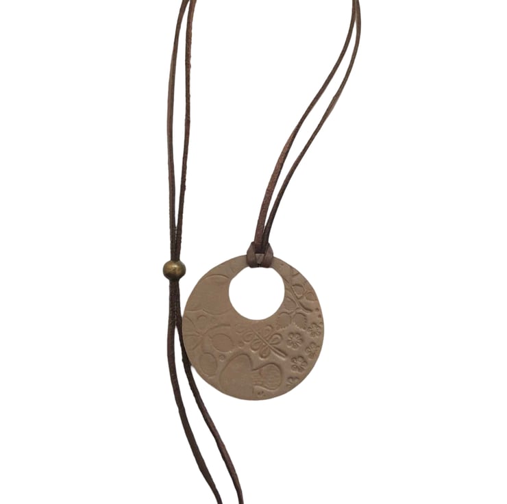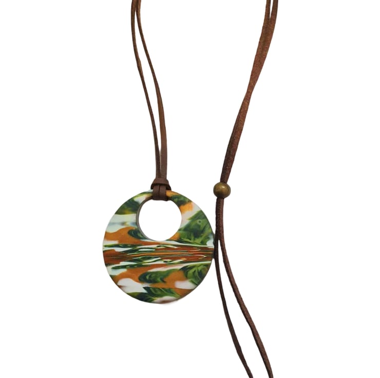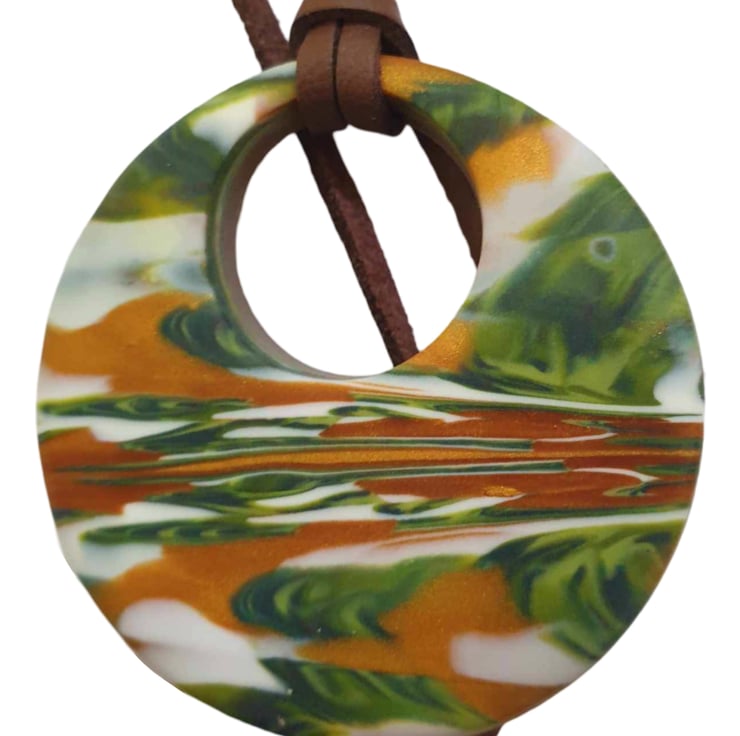 This beautiful polymer Clay pendant made by myself is strung on real suede leather and finished with sliding bead to shorten and lengthen the necklace, together with two smaller beads to finish off the ends. A stunning necklace that any lady would love.