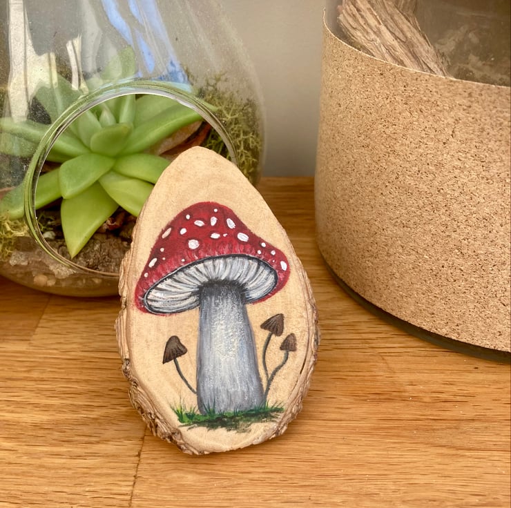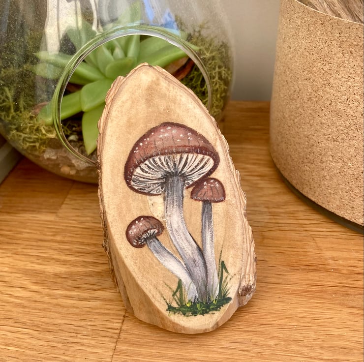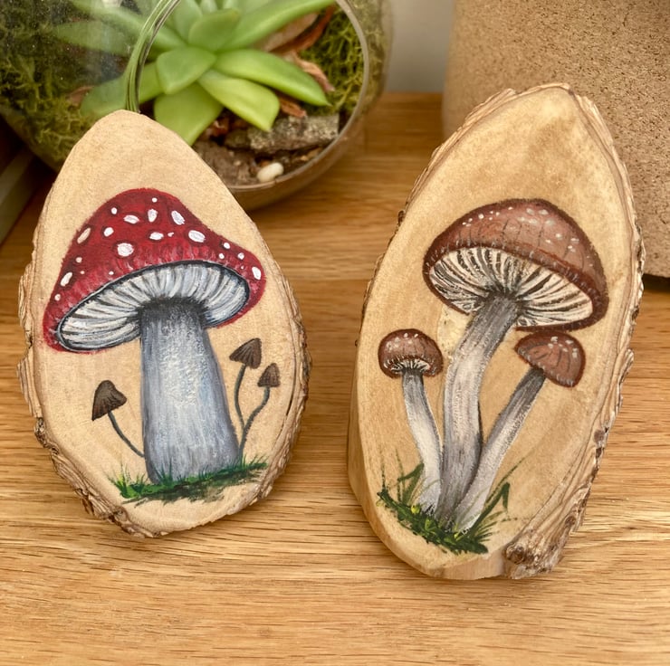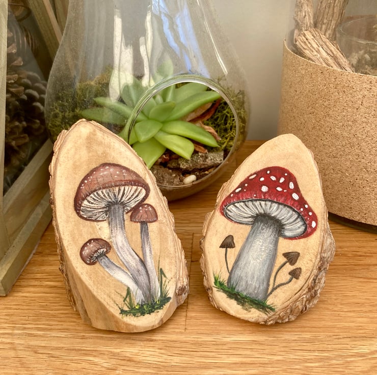 Toadstools are featured on this pair of small pieces of branch cut from my black lace ( sambucus nigra) bush.