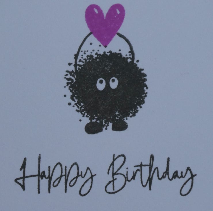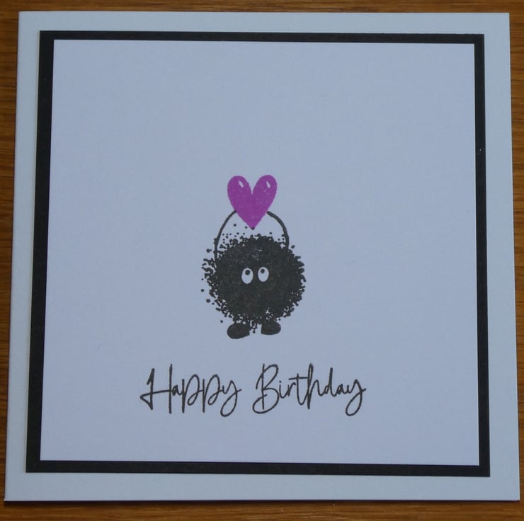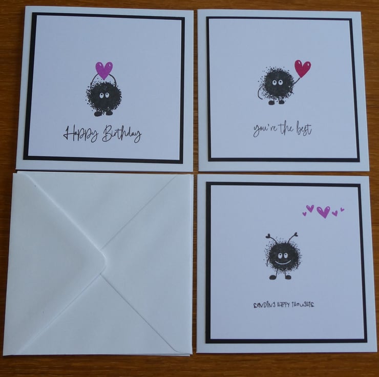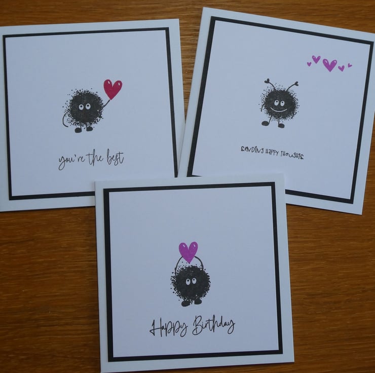 One card has a little black bug holding a pink heart above it's head and the message Happy Birthday.