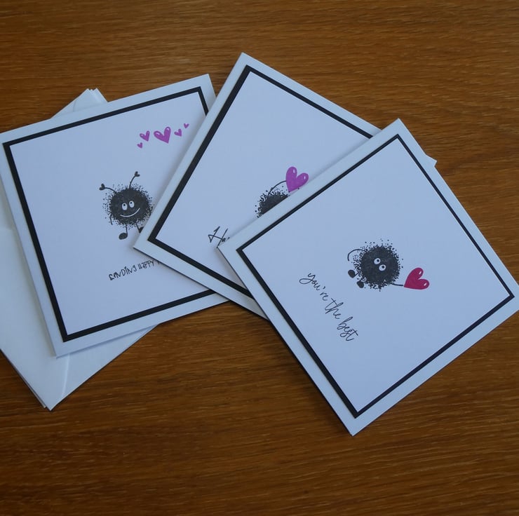 This set of 3 mini cards are all hand stamped with different designs of a little bug and hearts.