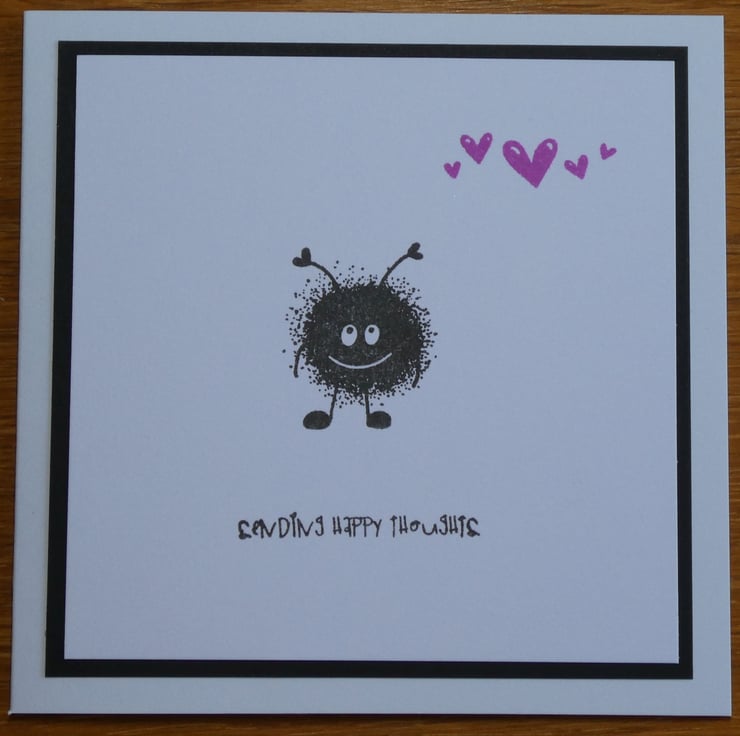 The final card shows a bug with 2 heart topped antenna on it's head with a row of pink hearts above and the message 'sending happy thoughts'.