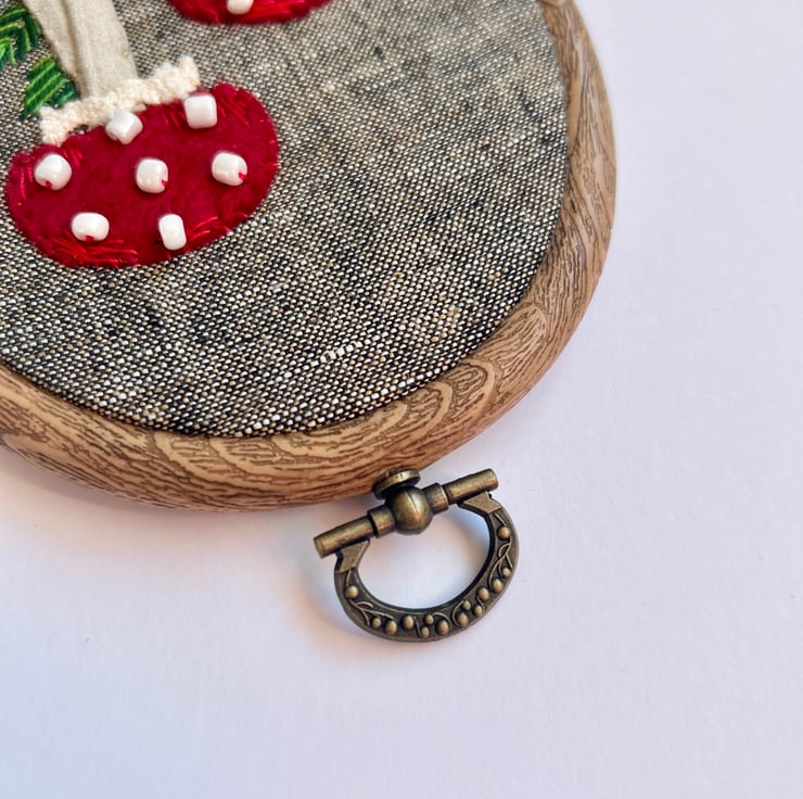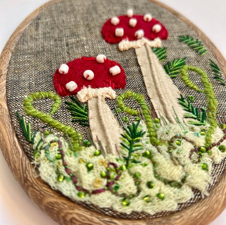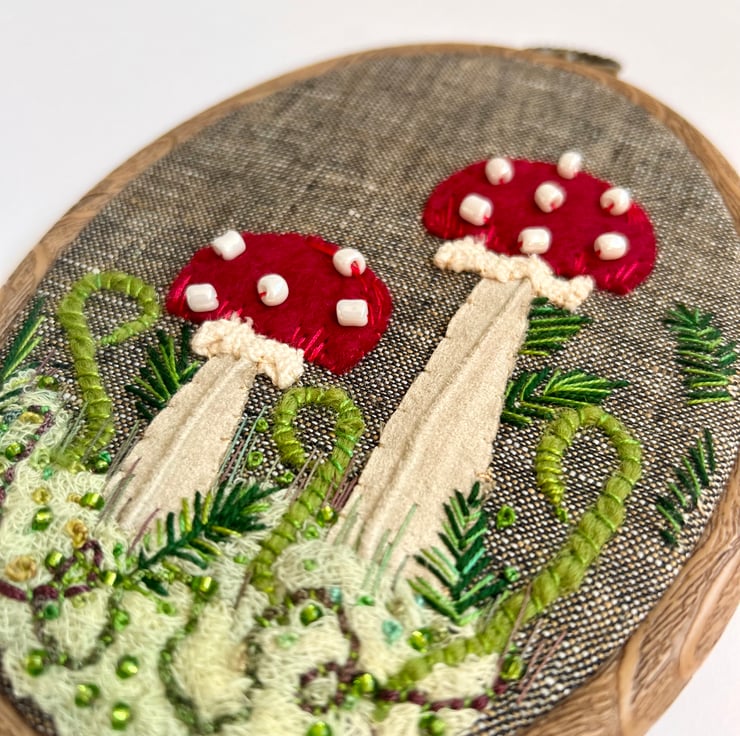 This is a small hand embroidered red capped mushroom woodland inspired piece.