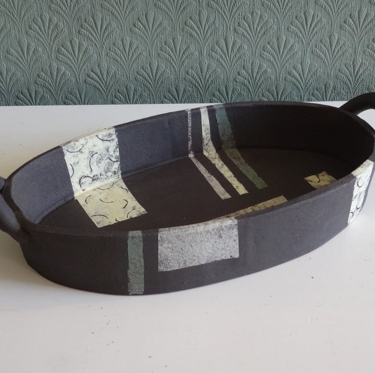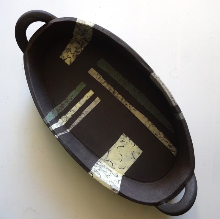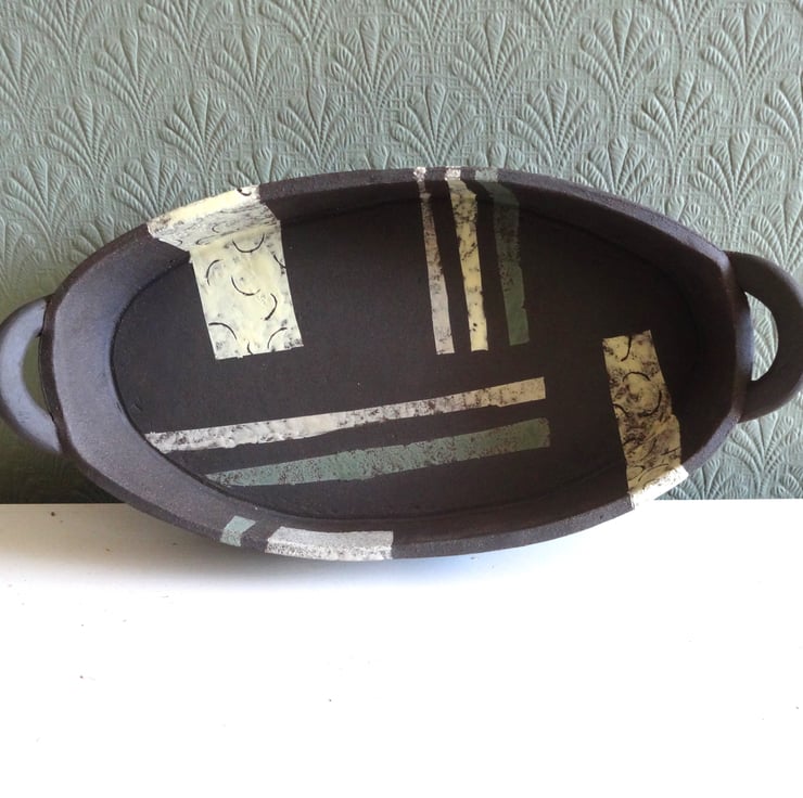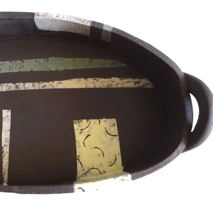 I used black stoneware clay to hand-form this decorative oval ceramic tray with small handles. It's a lovely gift for a birthday, housewarming, or just to say thankyou to someone special. The tray is an art inspired piece that could hold your keys in the hall, or your jewellery and trinkets in the bedroom, or just to provide a stylish focal point as a piece of ceramic creativity. After shaping the form while the clay is still soft, I decorated the clay surface with an abstract design of stripes and panels of lemon yellow, grey and green. To add extra interest I used the sgraffito technique to incise a pattern of simple curves on some of the areas of yellow.