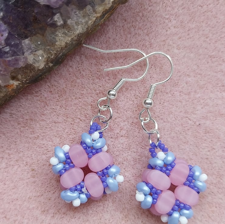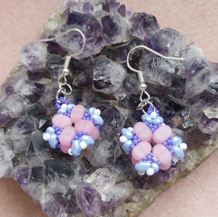 Pretty Spring style earrings made using pale pink, pale blue, white and lustre beads. Finished with silver plated ear wires.