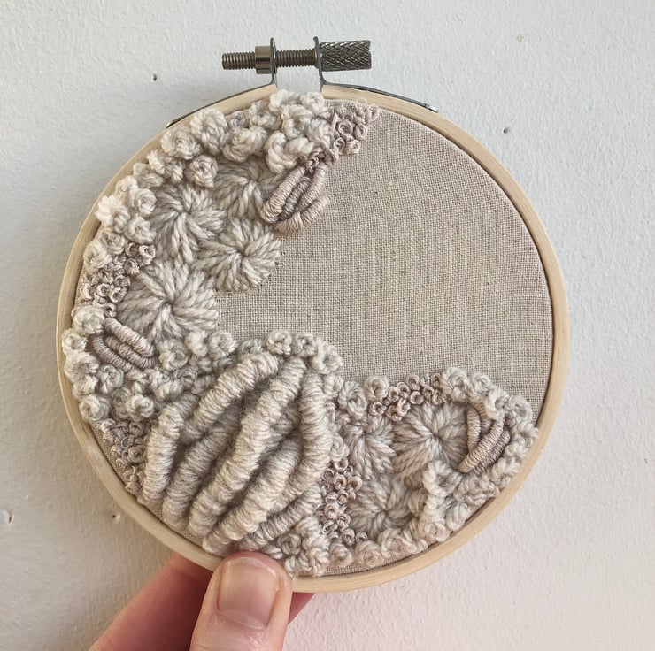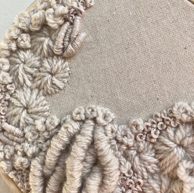 A study in beige a 4 inch one of a kind art piece. Embroidery thread and yarn has been hand stitched onto a similarly coloured light fabric in an abstract pattern. This has created a textured piece which is both eye catching and unique a perfect addition to any home.