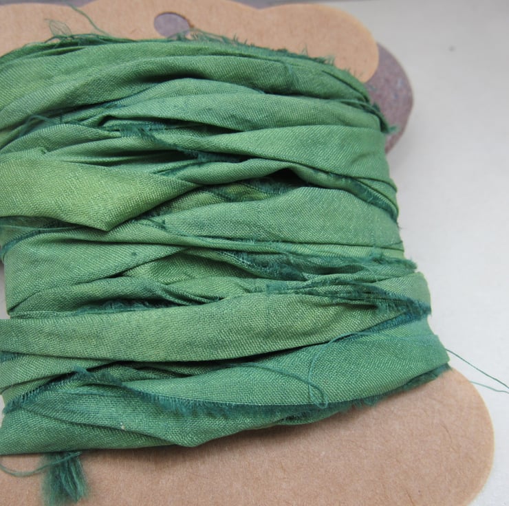 Hand dyed sari silk ribbon, dyed with natural weld dye and indigo to give a range of bright greens.