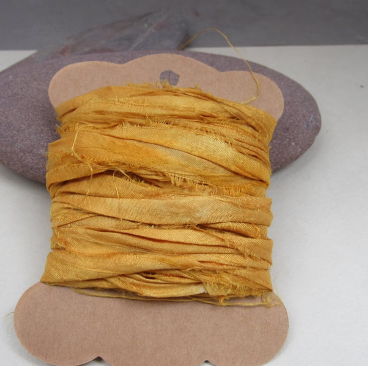 Hand dyed sari silk ribbon, dyed with natural onion dye to give a range of golden yellows.