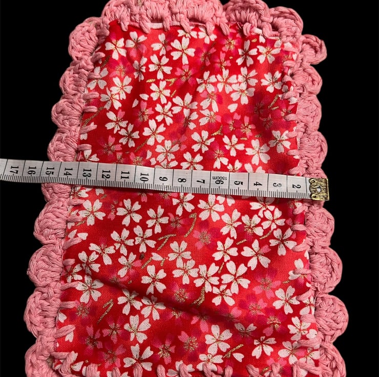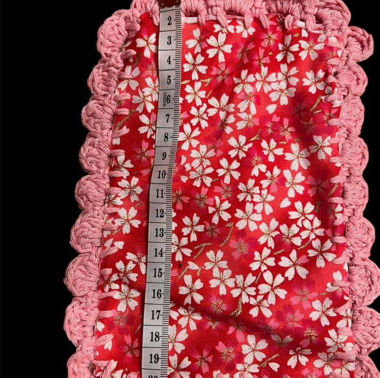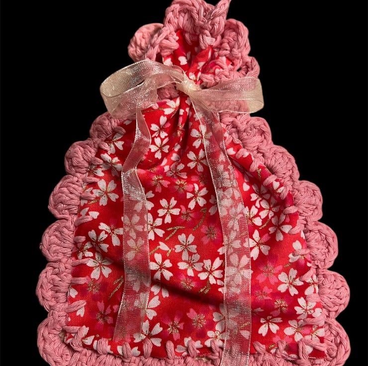 - Reusable Fabric Gift Bag with Crochet Trim: A sustainable, charming pink fabric bag adorned with intricate crochet detailing, perfect for presenting your gift in style.