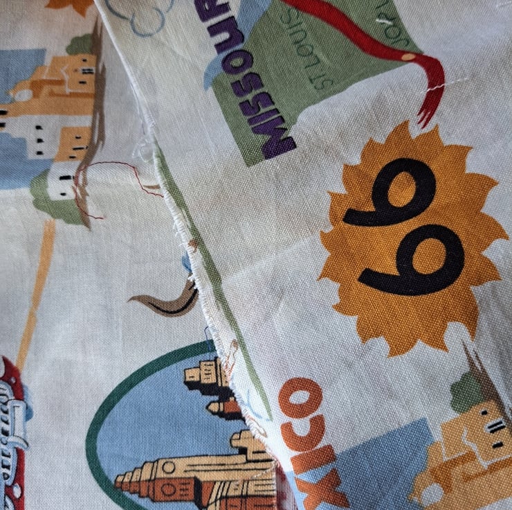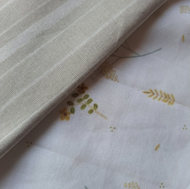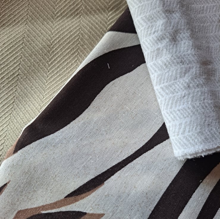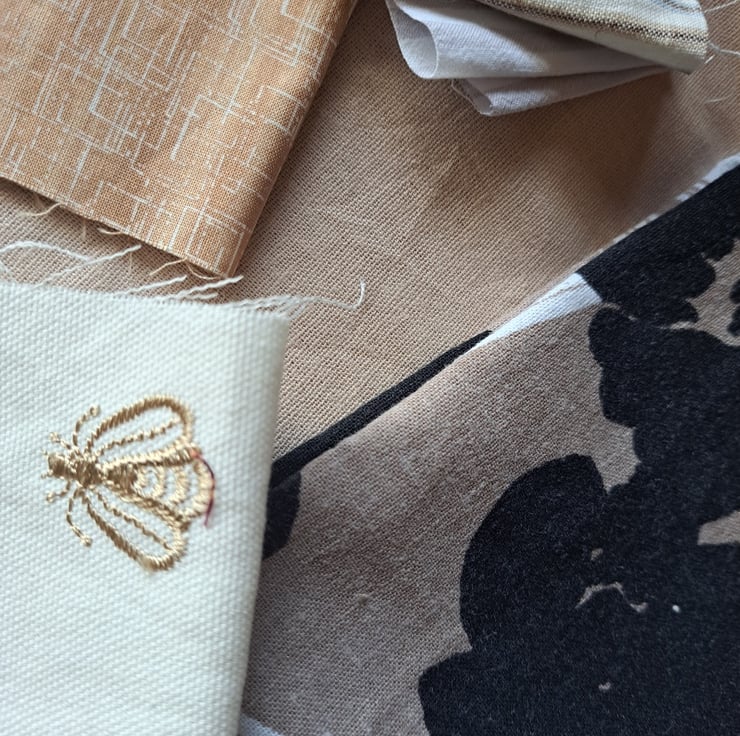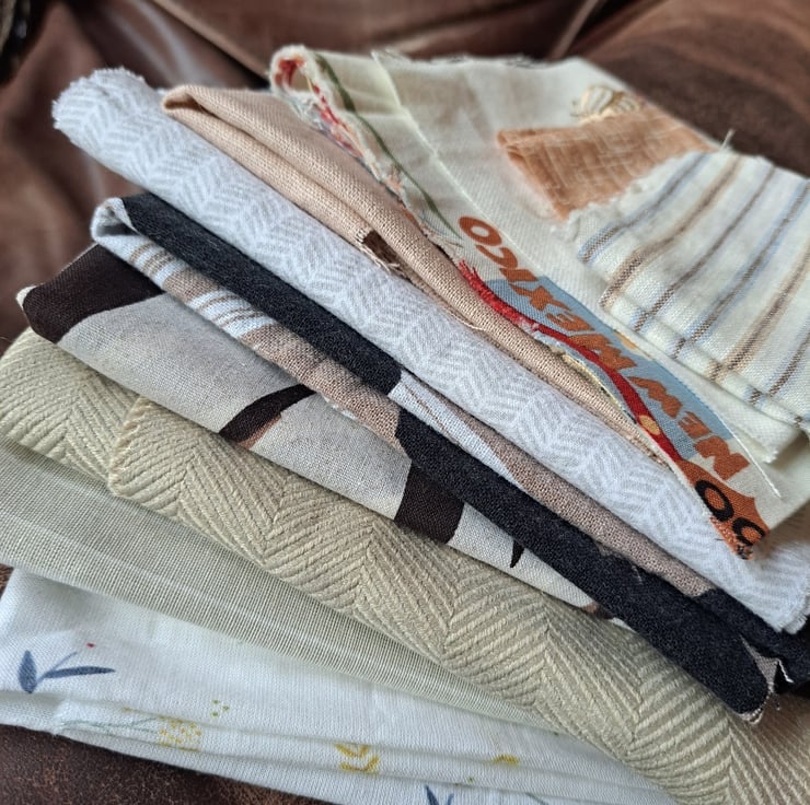 Beiges, creams and browns merge to make this warming bundle of twelve mainly cotton and linen fabrics (there's an unidentified piece of thicker fabric thrown in for good measure.). Designs include animal print, stripes, bees and even Route 66!