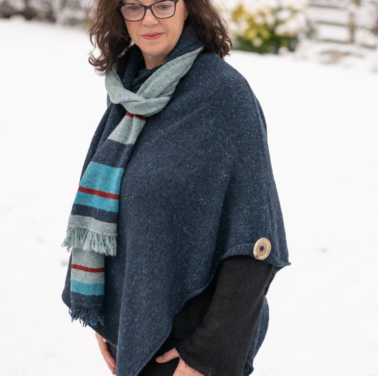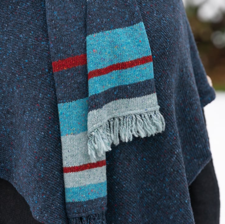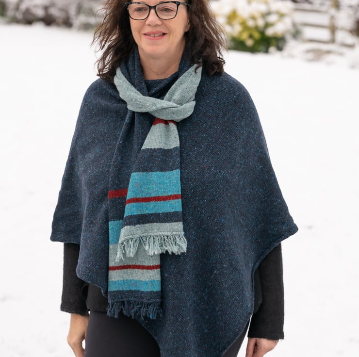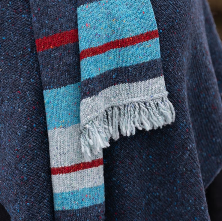 Crofter Collection is knitted in a lovely authentic 100% Merino quality Irish Donegal wool with a slight slub and coloured flecks running through it, creating a lovely texture and colours. This lovely unisex knit is so soft on the skin. It's a great length so you can wear it in lots of ways and the random-sized stripes in midnight blue, pale blue, turquoise and red are quite striking. Perfect for the winter months.