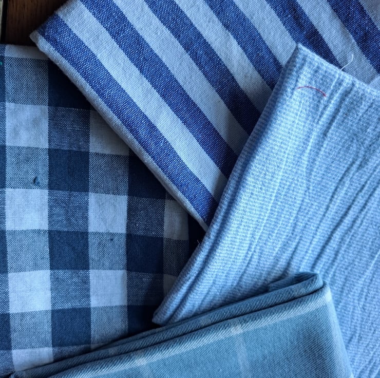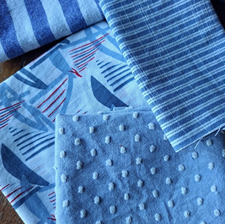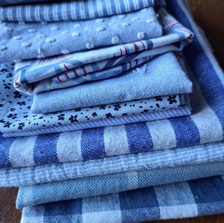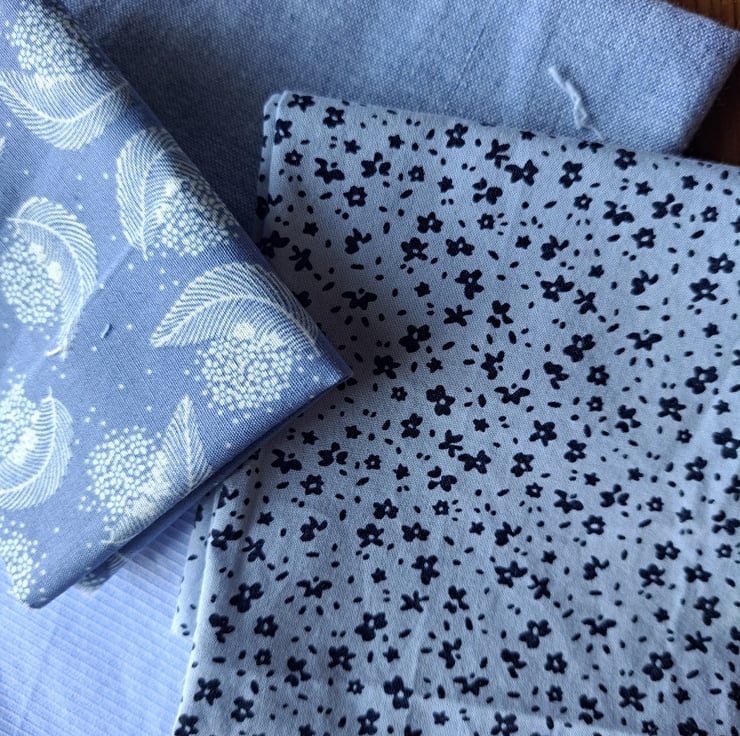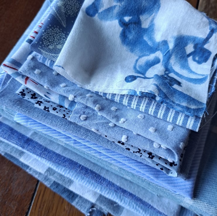 A softy, airy bundle of powder and pale blues which make you sleepy just to look at them. This bundle of mainly rescued and repurposed cotton and linen fabrics will add a gentle presence to your next textile project. The largest piece is 40cm by 31cm.
