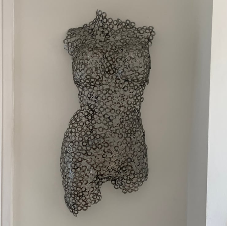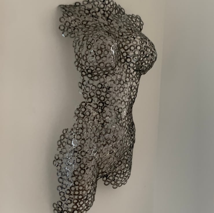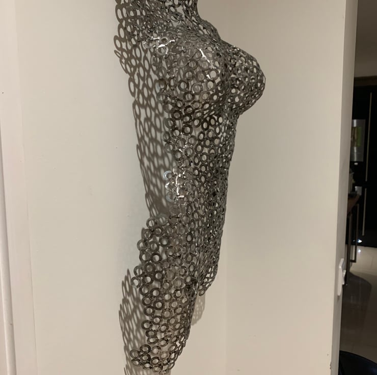 Wall hung naked lady made from steel washers welded together unique art work comes with steel hanging cable fitted approx 60 cm high 30 cm wide