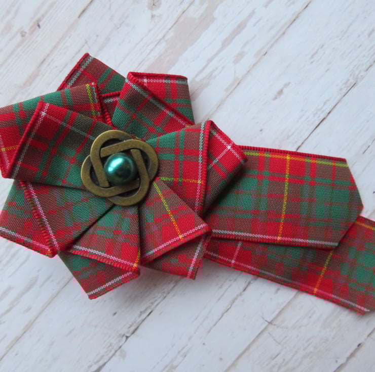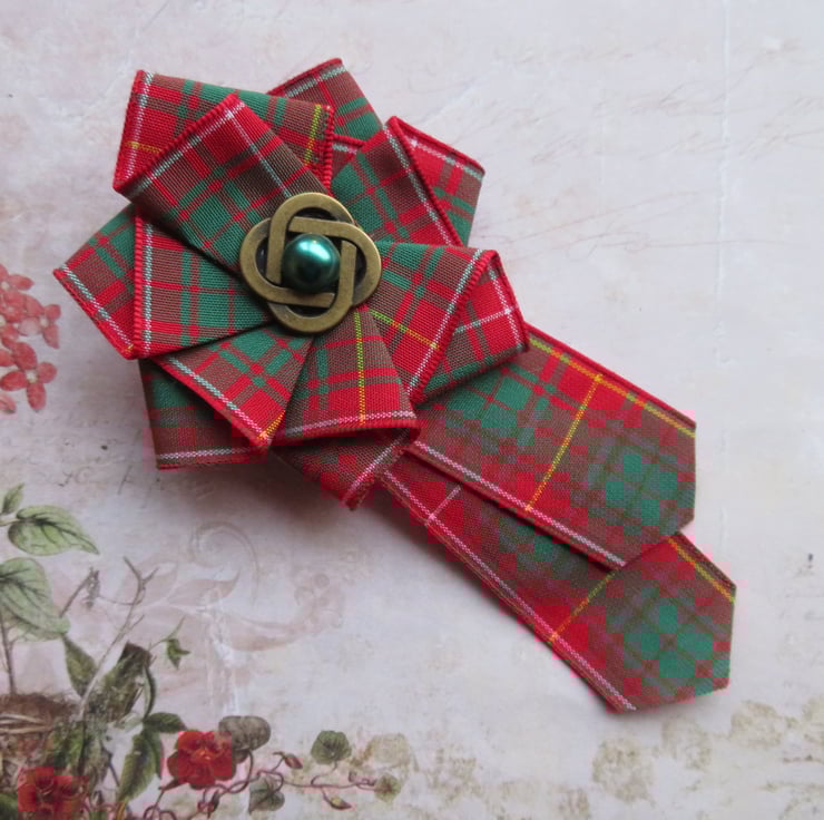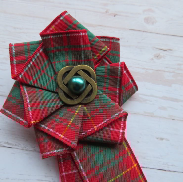 Made with a handmade and sewn ruffle of Bruce Ancient tartan ribbon with wide ribbon shaped trails and finished with a bronze tone Celtic Knot metal button with a bottle green pearl in the centre.