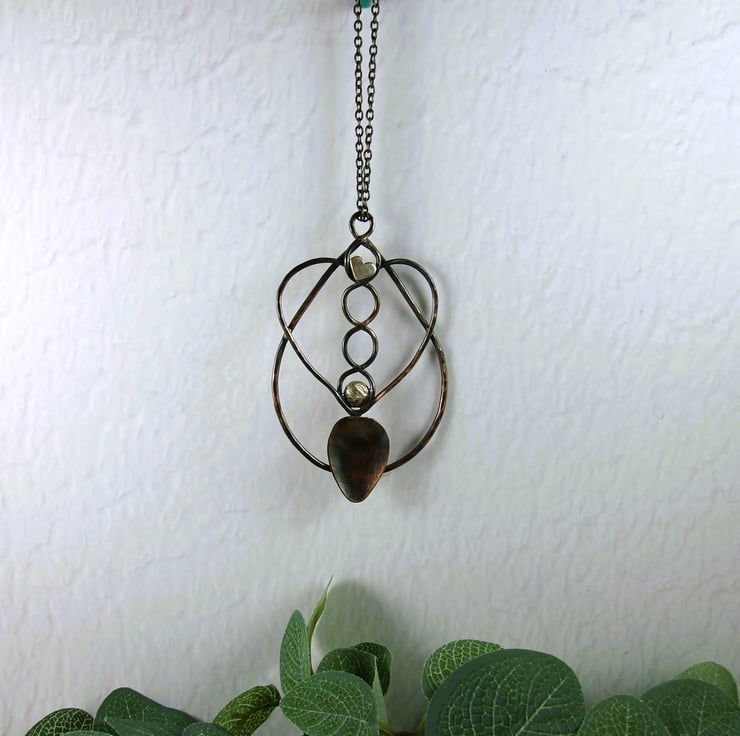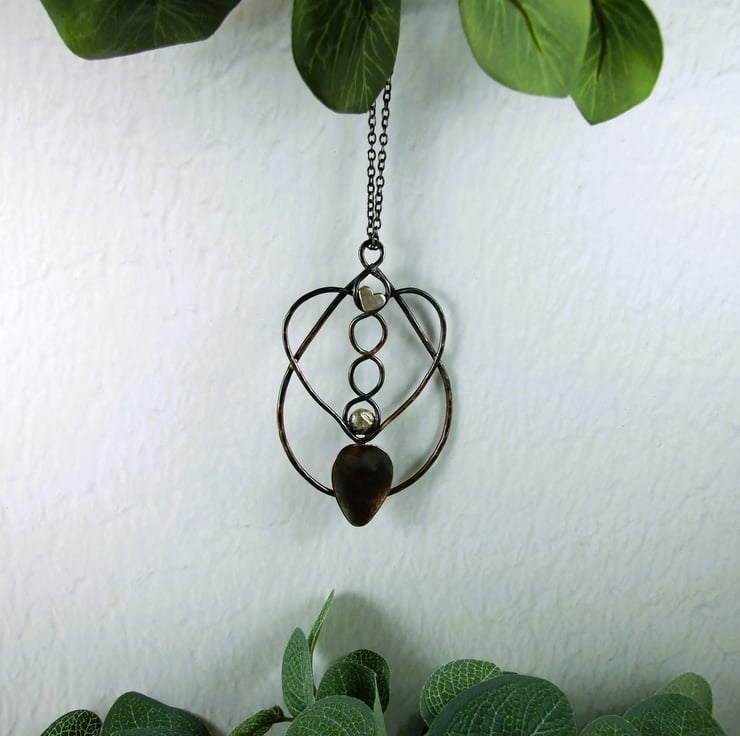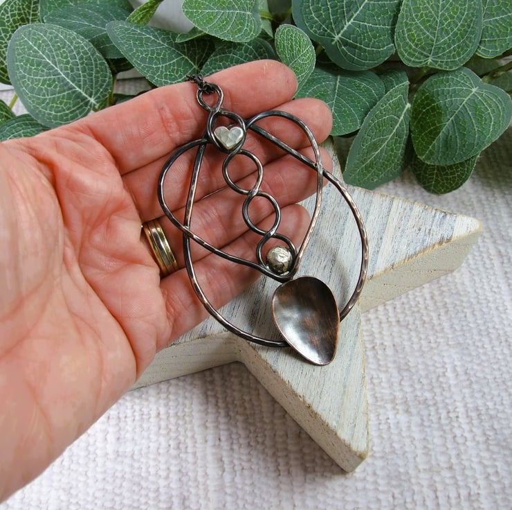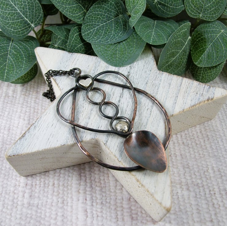 I have created the love spoon entirely by hand from pure copper wires and sheet in a freehand shape. I began by drawing the spoon bowl onto copper sheet, cutting and shaping then making the handle using copper wire. All shaped by hand and soldered together with some white metal accents for contrast. I have added copper chain for hanging.