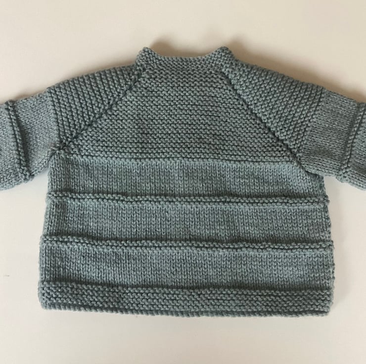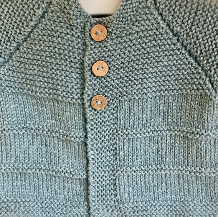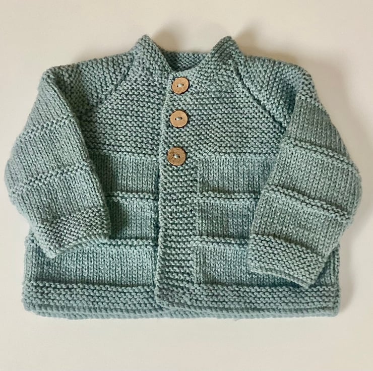 Attractive and versatile baby cardigan hand knitted by me in my Suffolk home. I have used a good quality baby yarn to make this little jacket that is soft and easy to wear. The beautiful colour is a soft green grey shade that is complemented by the three coconut shell buttons that fasten at the front. Would look equally good on a baby boy or girl and is knitted to fit from birth to three months approximately. Actual garment measurements are,