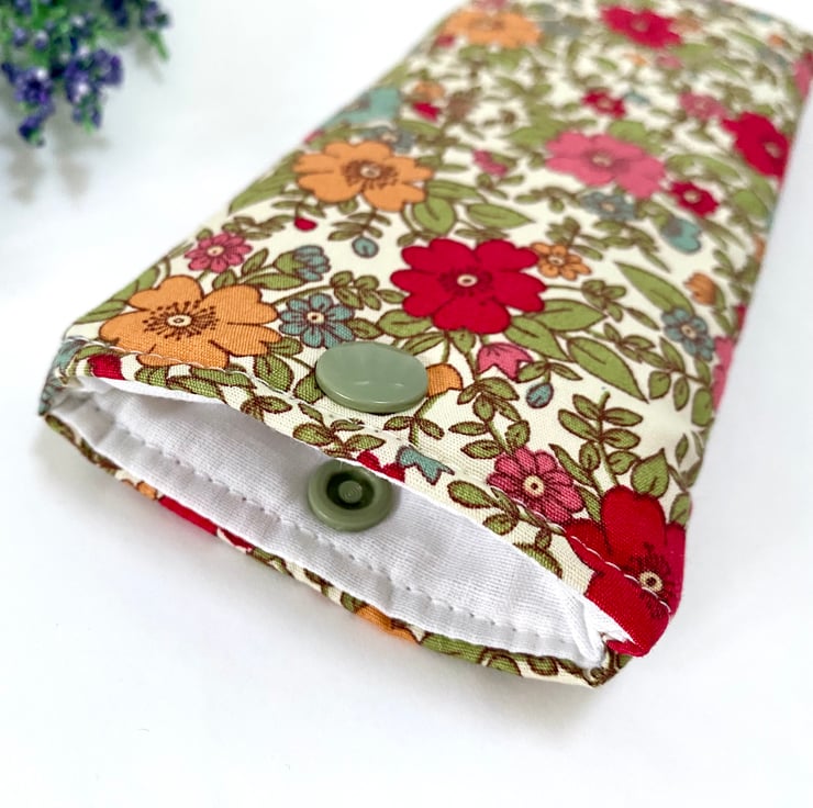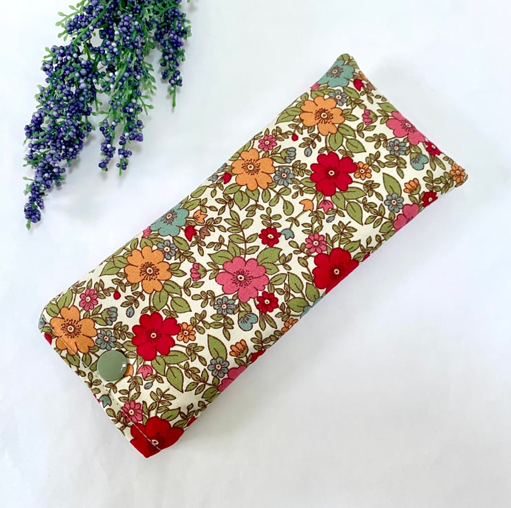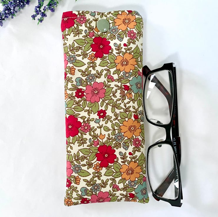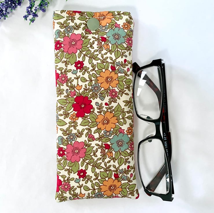 Beautiful cotton Rose and Hubble Fabric in a floral themed design with a white lined interior. Padded to add extra protection for your spectacles and a snap fastener to keep your glasses secure when not in use.
