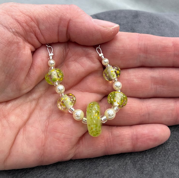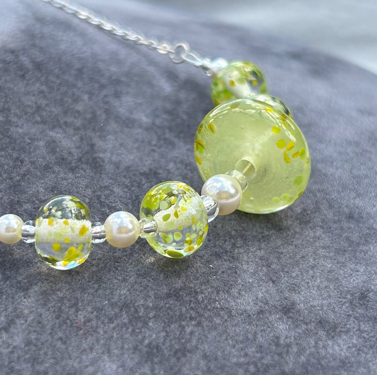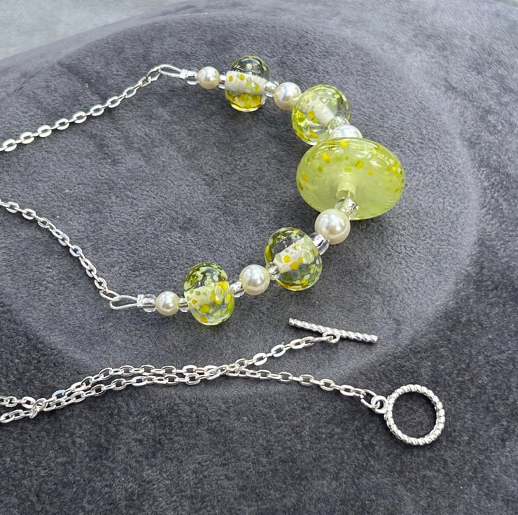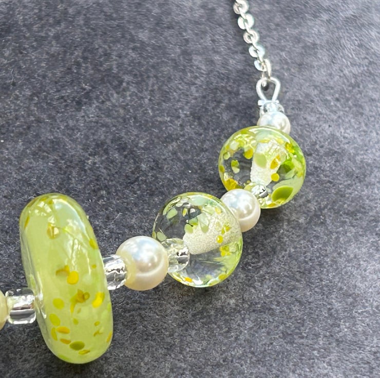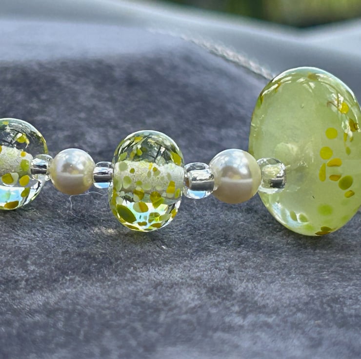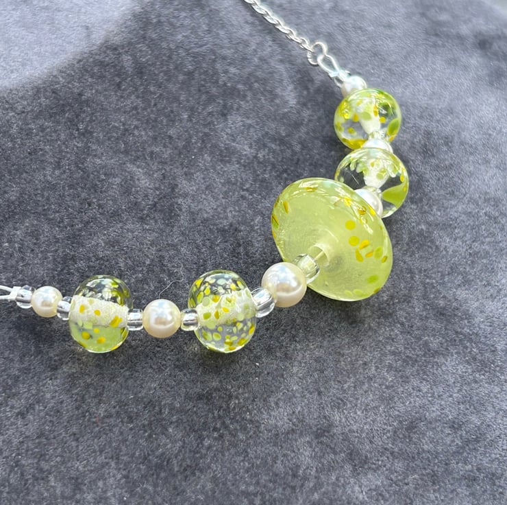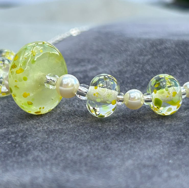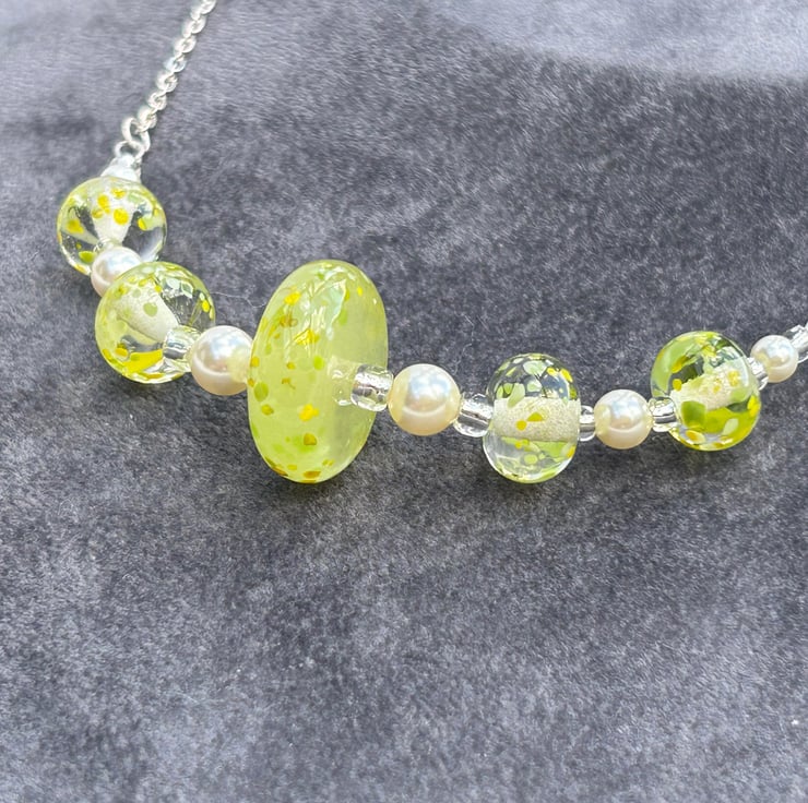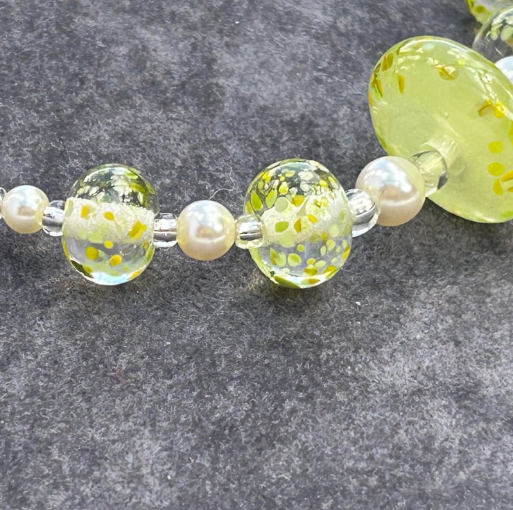 5 of my own handmade lampwork glass make up this necklace, 4 are clear with small pieces of lemon and lime coloured random pieces of glass melted onto the surface. The central bead was created using a beautiful glass in a semi opaque lemon yellow, with the small pieces of yellow and green glass melted in to match the other beads. This bead was then hand shaped into a disc with coloured glass pieces melted just onto the very edge of the disc.