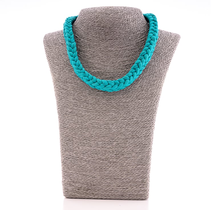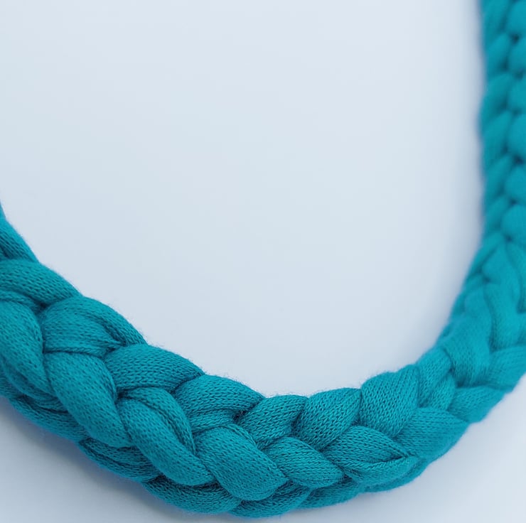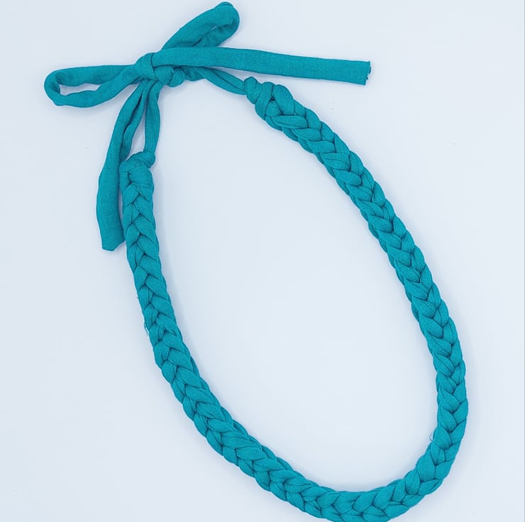 Add a pop of colour to your outfit with this beautifully handcrafted braided fabric necklace in a vibrant teal shade. Made from soft, upcycled cotton jersey, this necklace is lightweight, comfortable to wear, and eco-friendly.