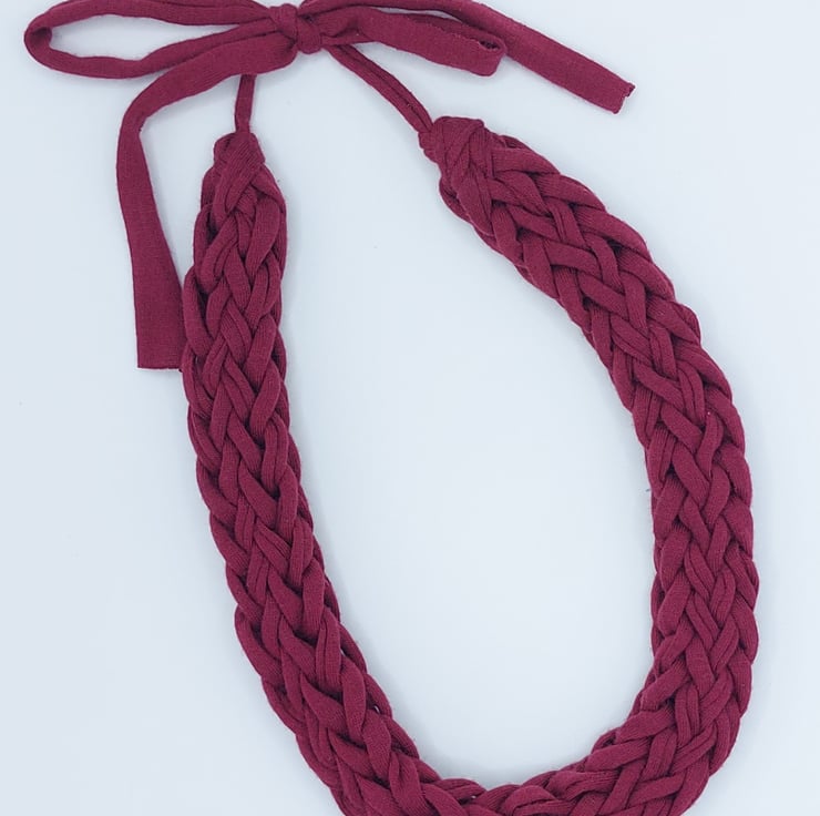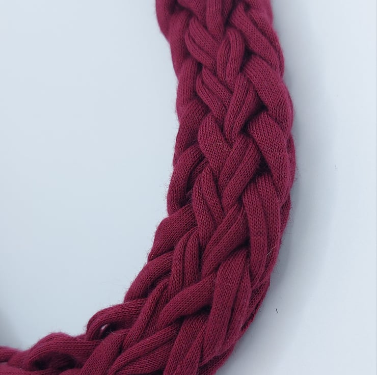 Add a bold pop of colour to your outfit with this striking handmade knitted necklace in a rich burgundy. Carefully crafted from soft, upcycled fabric, this lightweight accessory is both stylish and eco-friendly.