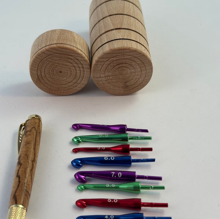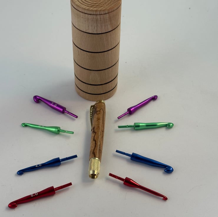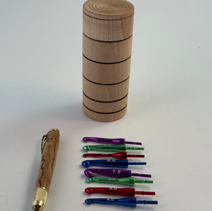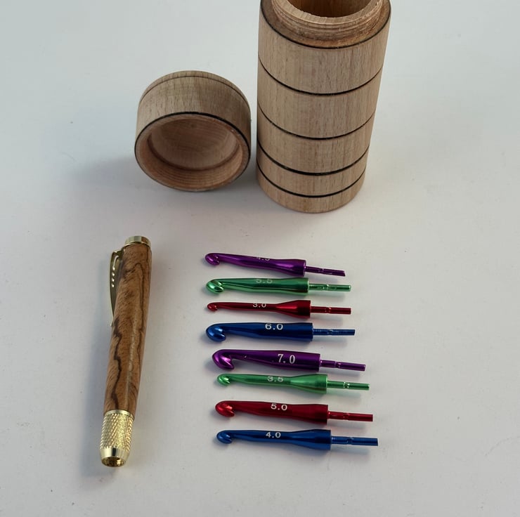 A set of 8 crochet hooks with sizes from 3 to 7 in multi coloured metal finish. The handle is Zebrano wood with gold coloured metal work. The handle and the 8 hooks will fit in the box, which is also made from Beech and has a screw top so that it does not come loose and spill the contents in you bag.....