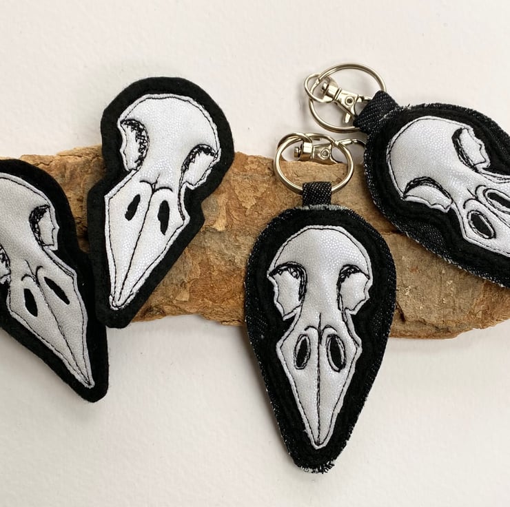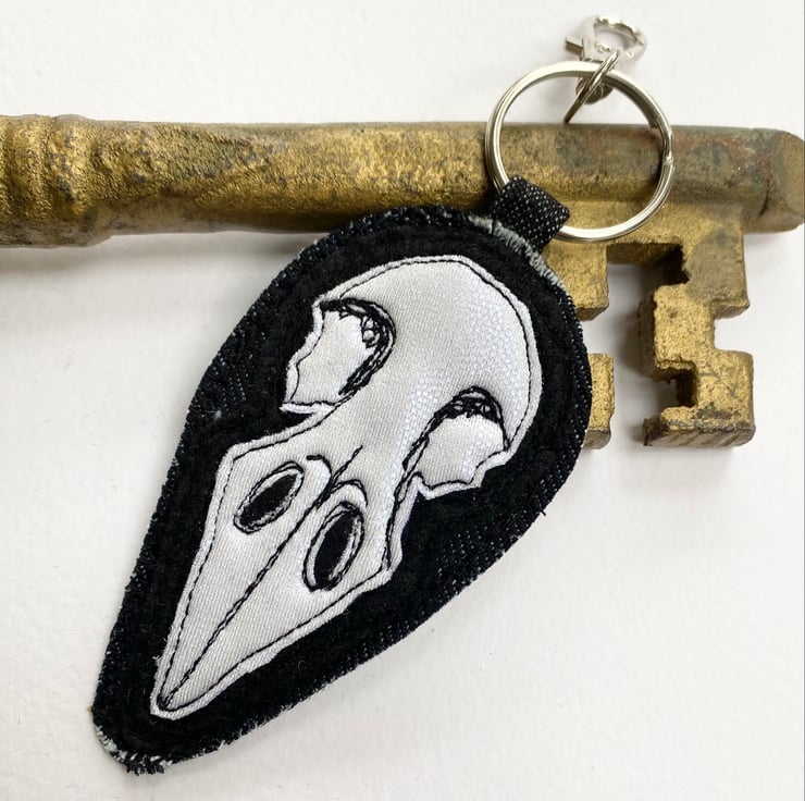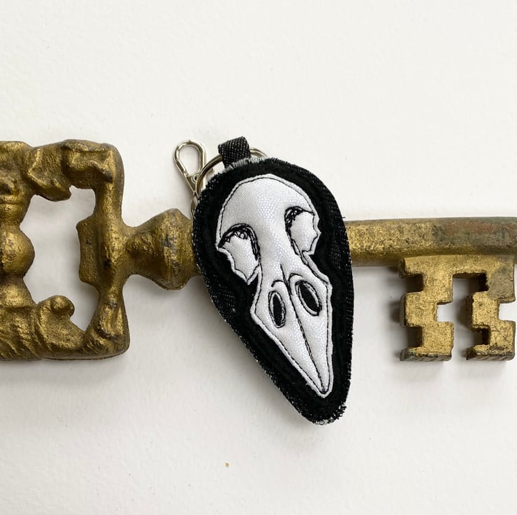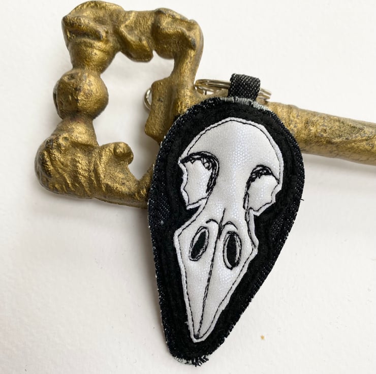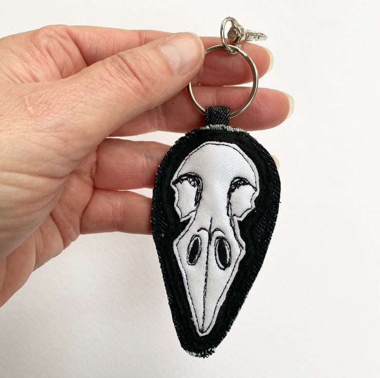 This striking up-cycled bird skull keyring is made with up-cycled fabric. It’s plain on the back. It measures 4.5 x 9cm. With the split ring and lobster clasp the length is 14cm.